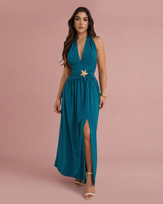 VESTIDO LARGO APLIQUE EN FORMA DE ESTRELLA DE MAR DORADA