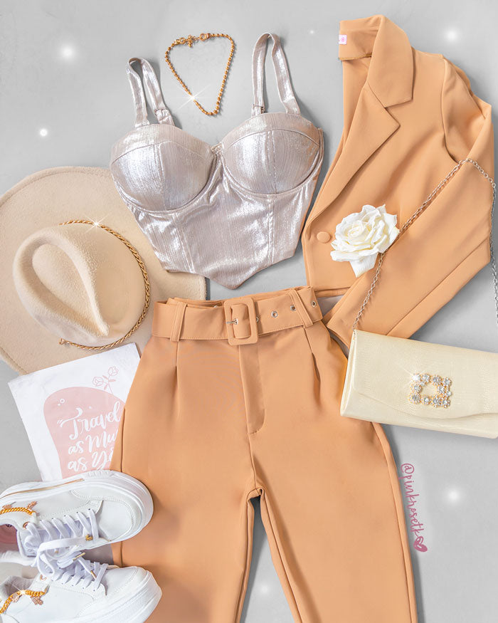 Descubre un nuevo nivel de elegancia con nuestro bustier dorado en punta de copas y tiras. Brinda soporte y realza tu silueta con su diseño de punta de copas, mientras las tiras añaden un toque sensual. Perfecto para una noche especial o para agregar glamour a tu look diario. ¡Hazte notar con este bustier de calidad!