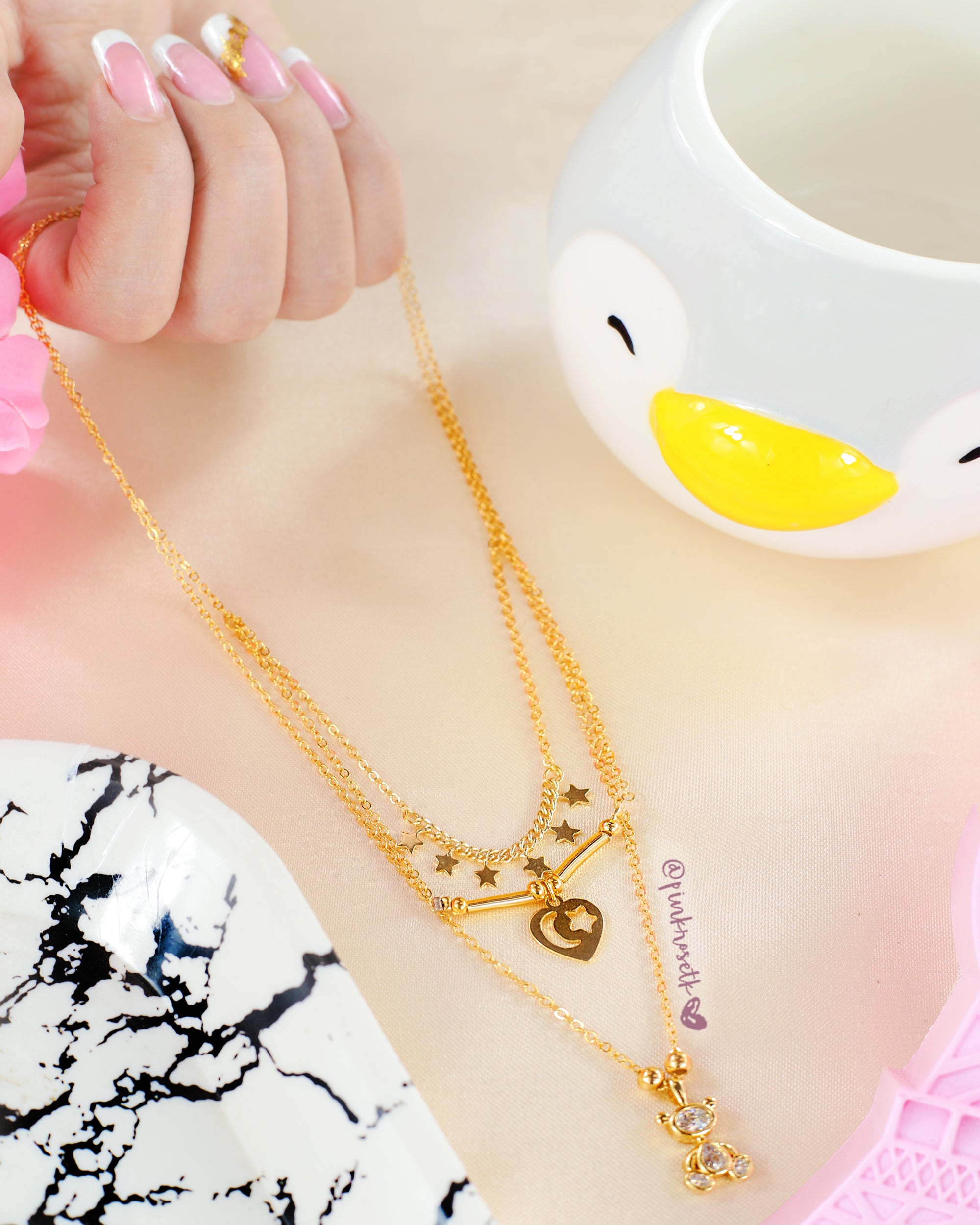 ¡Cambia tu look con este collar único! Luce elegante con un toque de brillo dorado. Este collar adornado con estrellas, corazones y un oso lleno de alegría, sutilmente engastado con brillo, ¡es el adorno perfecto para tu vestimenta! ¡Tú mereces destacar!