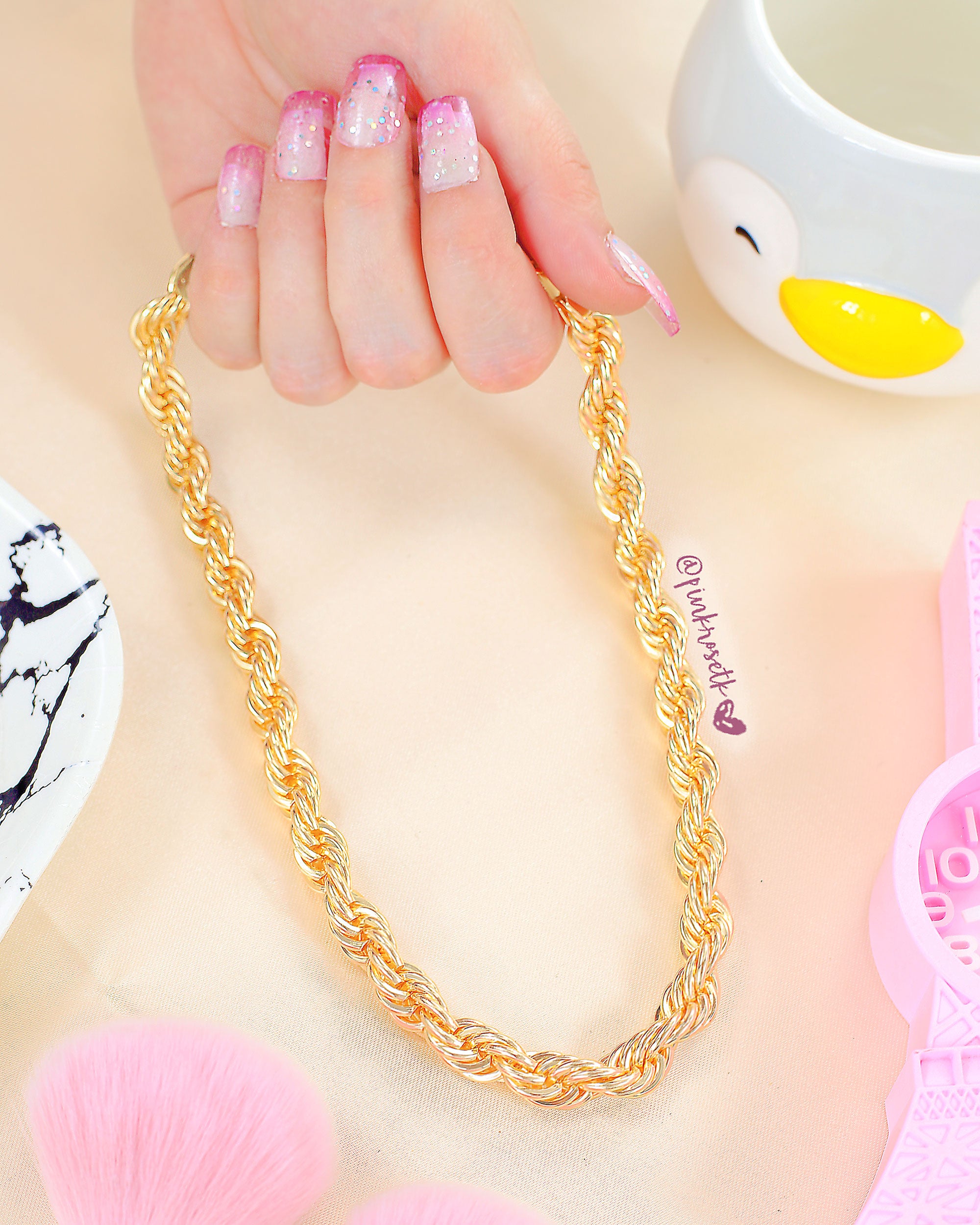 Este collar dorado tipo lazo grueso es una pieza suntuosa con una apariencia convincente. Esta joya es una selección ideal para cualquier look de noche; con destellos dorados y un patrón de lazo único, añadirá un estilo sofisticado a cualquier ocasión.