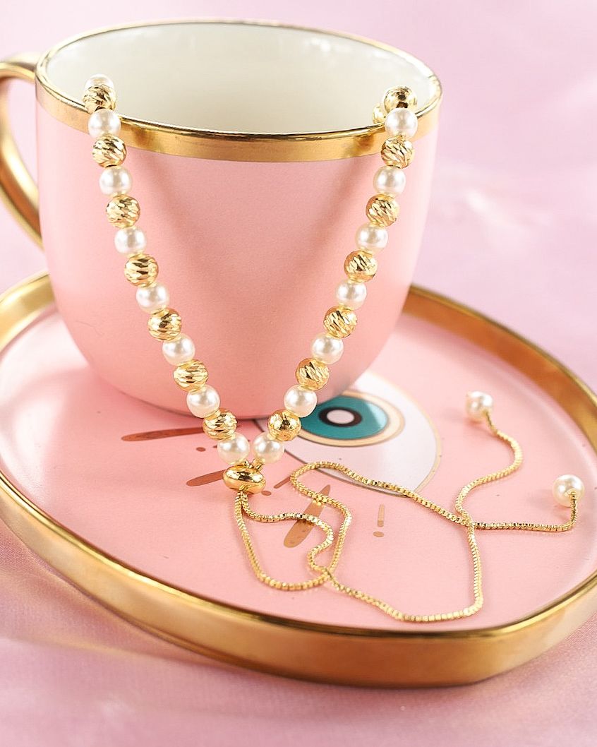 ¡Añade un toque de elegancia a tu atuendo con nuestro collar tipo gargantilla de perlas y balines dorado! Hecho de materiales de alta calidad, este collar cuenta con un diseño clásico pero moderno que te hará destacar en cualquier ocasión. Perfecto para regalar o para lucir en una cena romántica. ¡Haz una declaración de estilo con este collar!