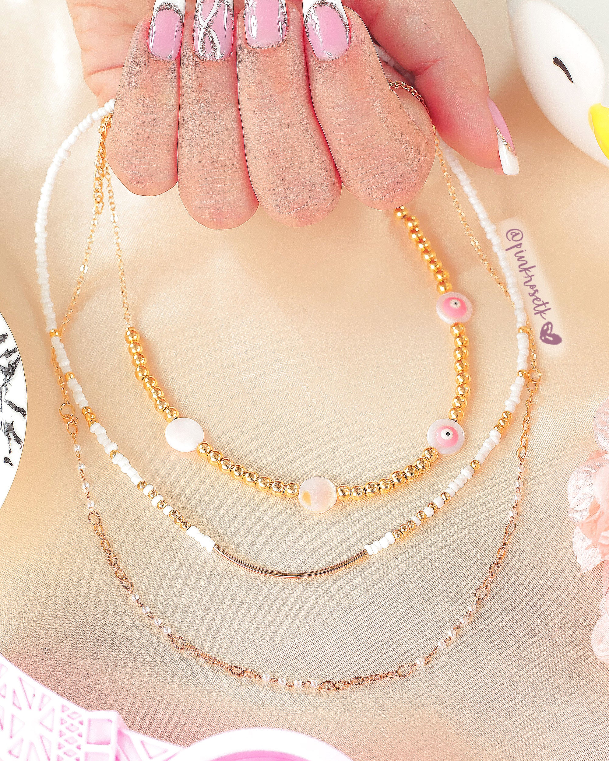 Collar triple cadena que fusiona elegancia y diversión con perlas, chaquiras y ojitos para darle a cualquier look un toque de sofisticación y estilo.