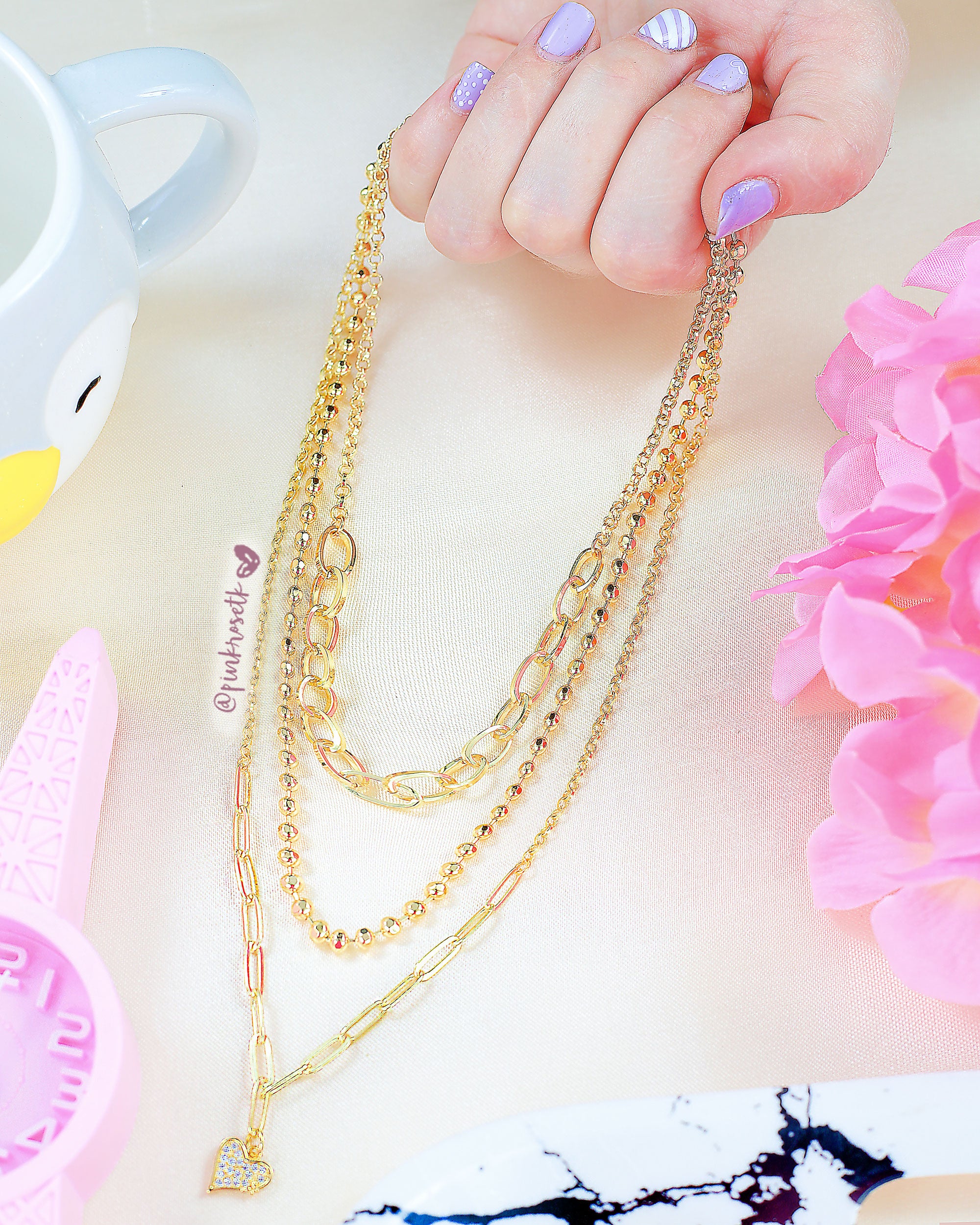 Este collar único está diseñado con un triple eslabón en balines y un dije corazón en el centro. Está hecho de metal plateado y adornado con una capa de oro. Esta joya ligera es una excelente opción tanto para el día como para la noche.