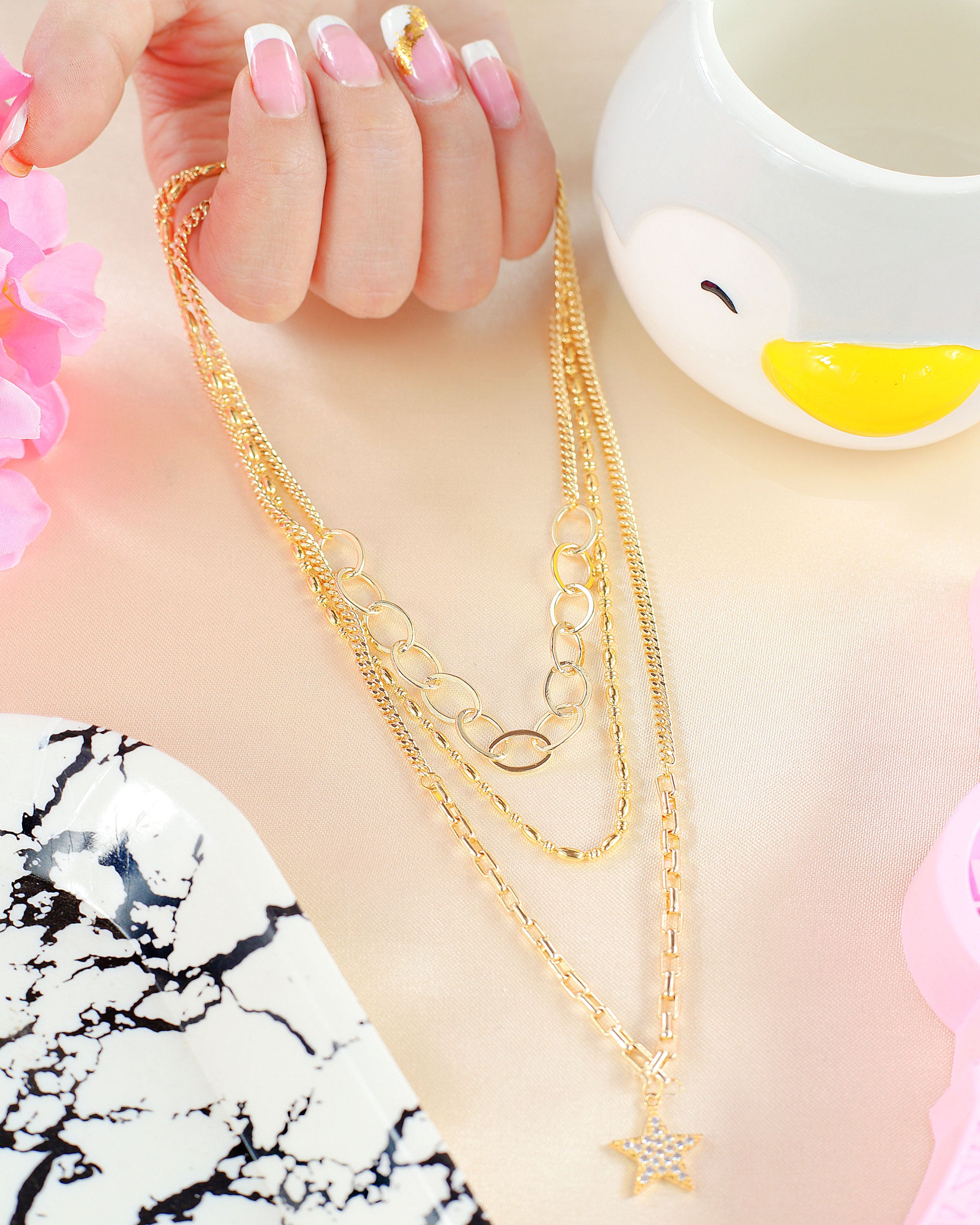 Un collar dorado de tres eslabones y una estrella, una joya con estilo moderno y clásico a la vez. Hecho con materiales ligeros y resistentes para que lo lleves durante mucho tiempo. Esta pieza única se convertirá en tu favorita.