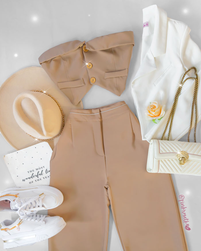 Pantalón camel bota ancha línea blanca pretina