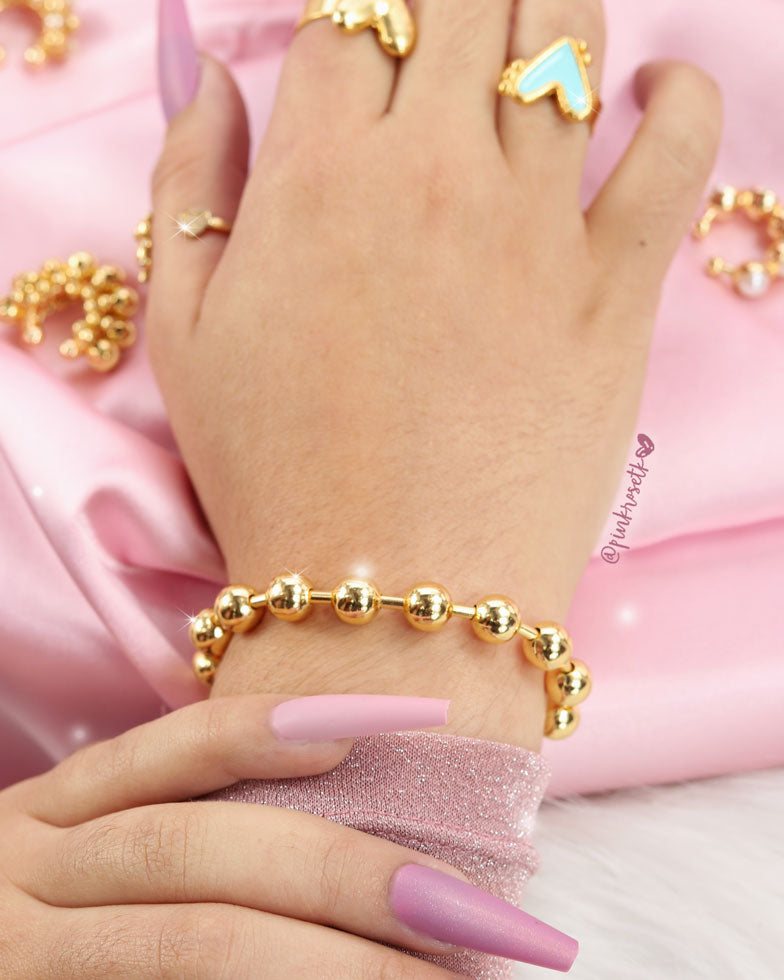 ¡Haz una declaración de moda con nuestra elegante pulsera dorada! Hecha con balines de 8 mm, esta pulsera es perfecta para cualquier ocasión. Añade un toque de brillo y elegancia a tu look con esta pieza única. ¡Consigue la tuya hoy mismo y haz una declaración con estilo!