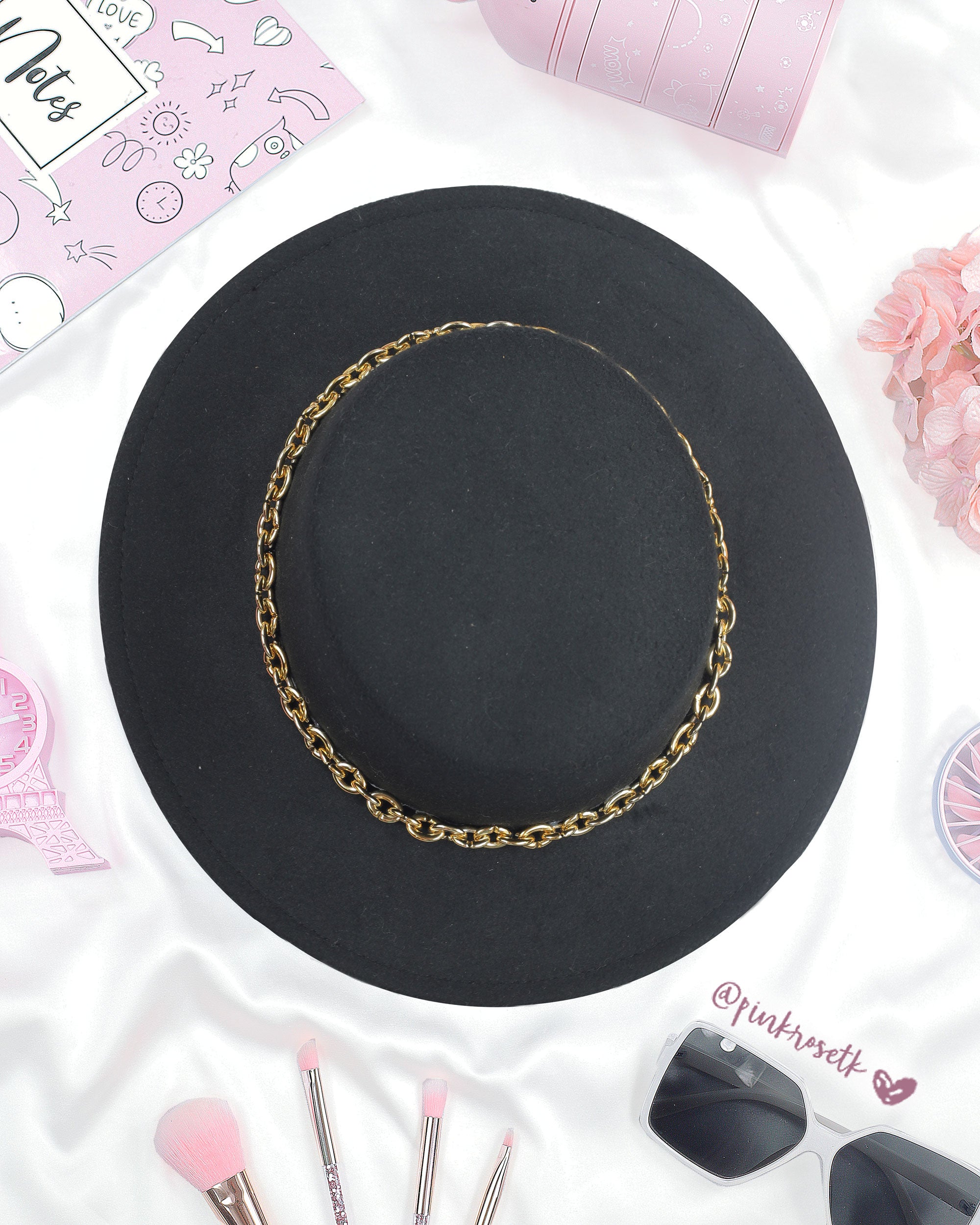 El sombrero plano feddora clásico negro con cadena dorada es la combinación perfecta de estilo clásico y toque moderno. Con su diseño elegante y la cadena dorada como detalle, este sombrero es un complemento ideal para darle un toque sofisticado y chic a cualquier conjunto. Perfecto para una tarde de compras o un brunch con amigas.