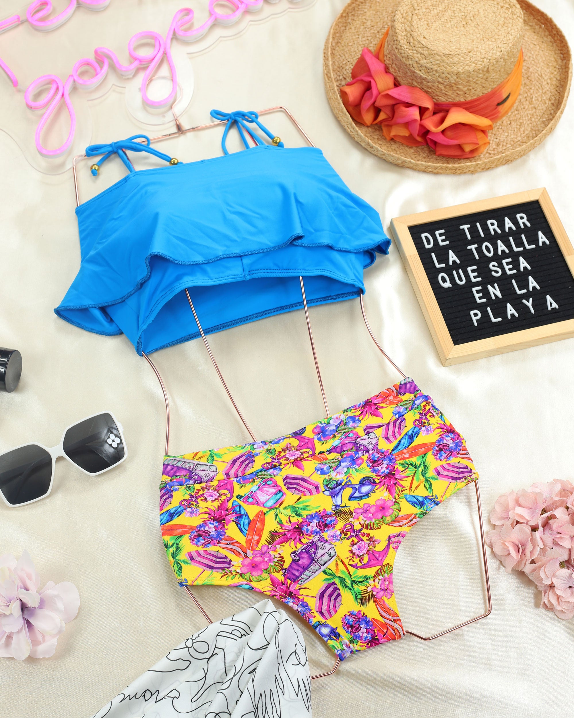 Este vestido de baño dos piezas combina el azul brillante con el amarillo para una sensación refrescante. Ambos colores se combinan perfectamente para crear un look atrevido y moderno. Esta versátil prenda puede ser usada en la playa o en la piscina. ¡Sé la envidia de tus amigos con este vestido de baño único!