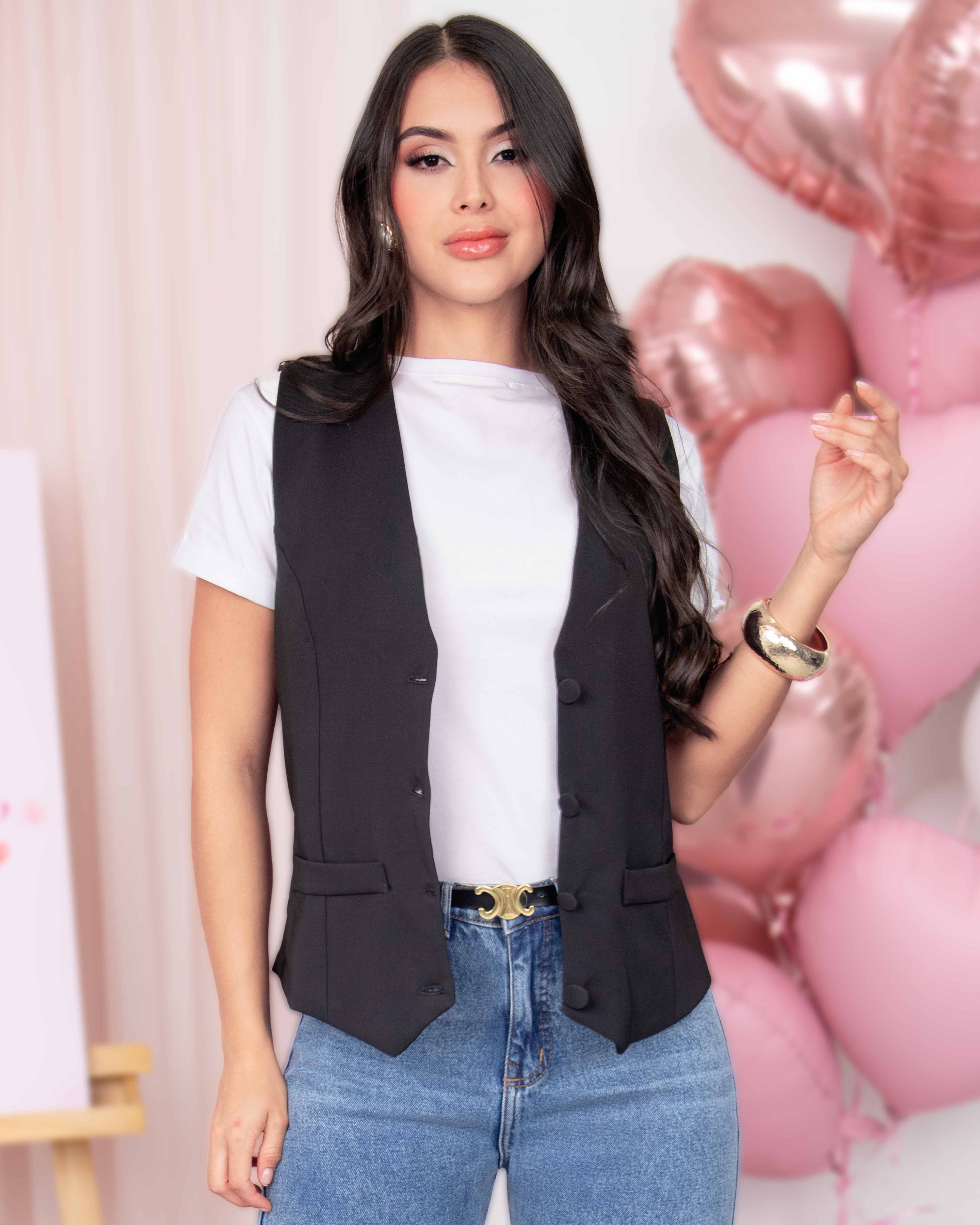 Perfecto para llevar solo o como complemento bajo un blazer, este chaleco es ideal para lograr un estilo sofisticado en la oficina, reuniones o salidas especiales. Los botones forrados aportan un detalle refinado, mientras que los bolsillos falsos decorativos le dan un acabado minimalista y chic.