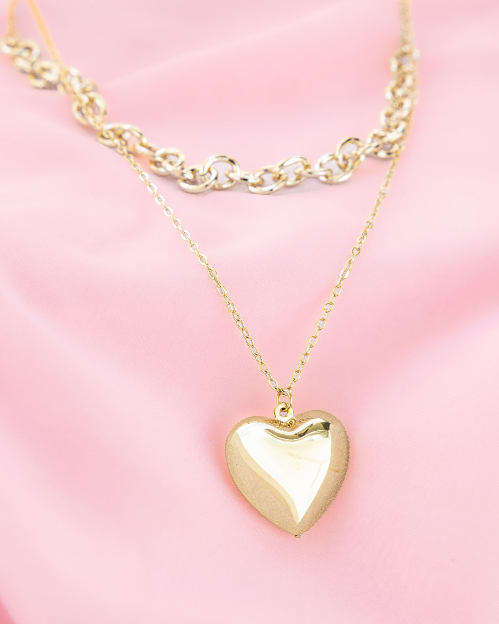 Este delicado collar doble destaca por su diseño moderno y romántico, perfecto para realzar cualquier outfit con un toque femenino y elegante. La pieza combina dos estilos de cadena en acabado dorado brillante: una cadena superior de eslabones gruesos que aporta carácter y tendencia, y una cadena inferior fina y delicada que sostiene el dije principal.