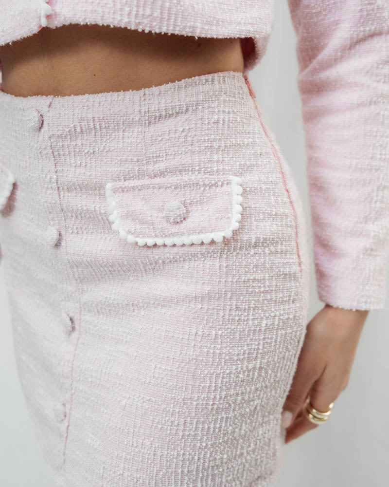 La falda de corte recto y largo mini mantiene la armonía del diseño con botones frontales y bolsillos decorativos que complementan perfectamente el blazer. Su confección en tela tipo tweed brinda textura, estructura y un acabado elegante ideal para ocasiones especiales o looks formales chic.