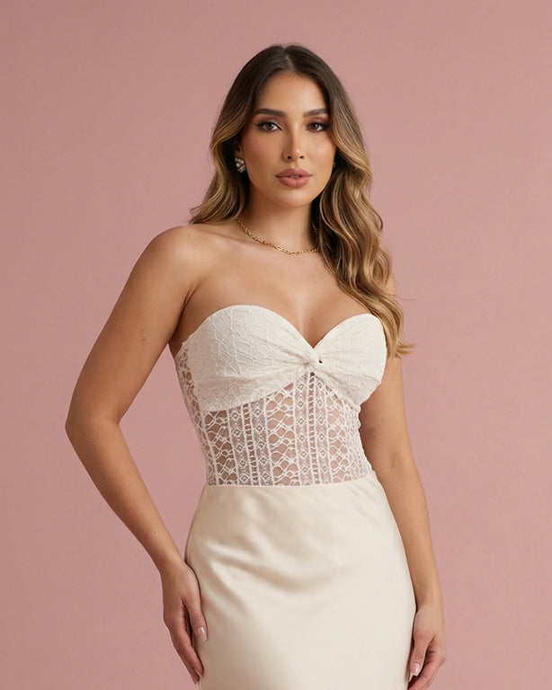 Resalta tu feminidad con la blusa de encaje strapple con nudo en copas, una prenda sofisticada que combina sensualidad y elegancia. Su diseño sin tirantes estiliza los hombros y el detalle del nudo en el busto aporta un toque delicado y atractivo. Confeccionada en encaje de alta calidad, esta blusa es ideal para cenas, salidas nocturnas o eventos especiales, permitiéndote crear looks modernos, románticos y llenos de personalidad.