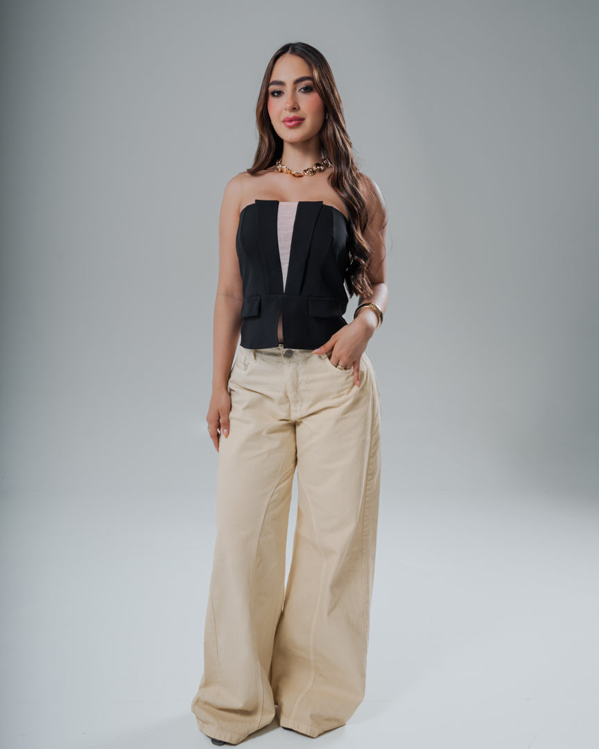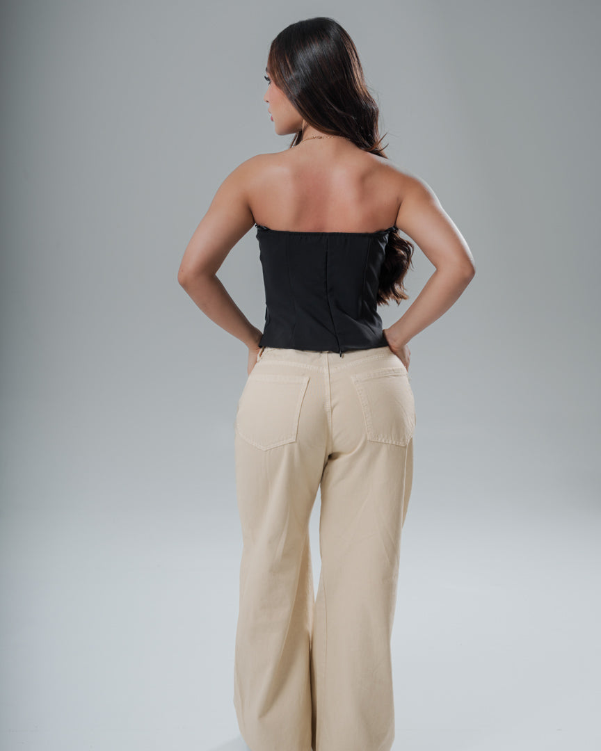CROP TOP ENCAJE COPAS TIRAS CORSET ATRAS - S / BEIGE