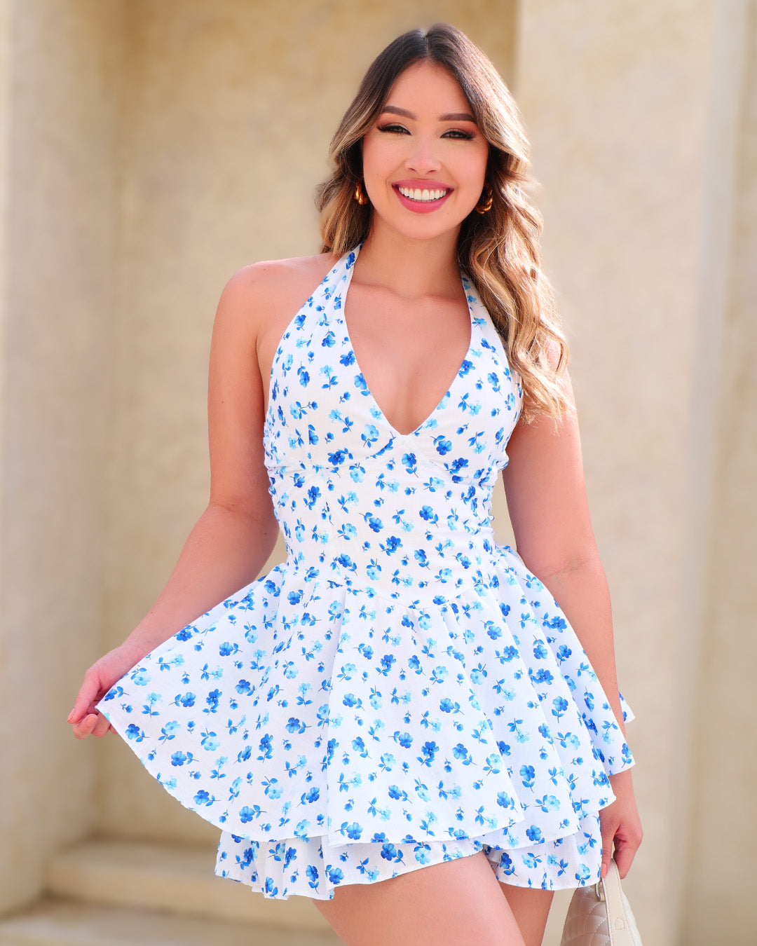 Romper con Estampado de Flores Azules y Tirante para Amarre en el Cuello