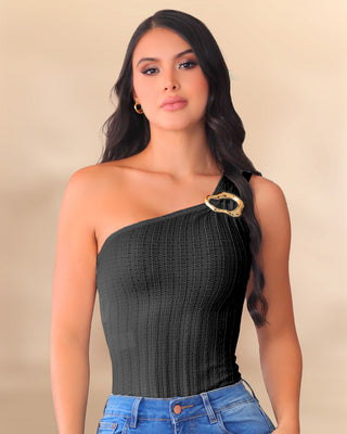 La blusa tejida de un solo hombro con aplique dorado es la prenda ideal para destacar con elegancia y estilo. Su diseño asimétrico realza la silueta y el detalle metálico dorado añade un toque sofisticado y moderno. Elaborada en tejido suave y ajustado, ofrece comodidad y un acabado chic que combina perfecto con pantalones o faldas de talle alto. Ideal para ocasiones especiales o salidas nocturnas. ✨