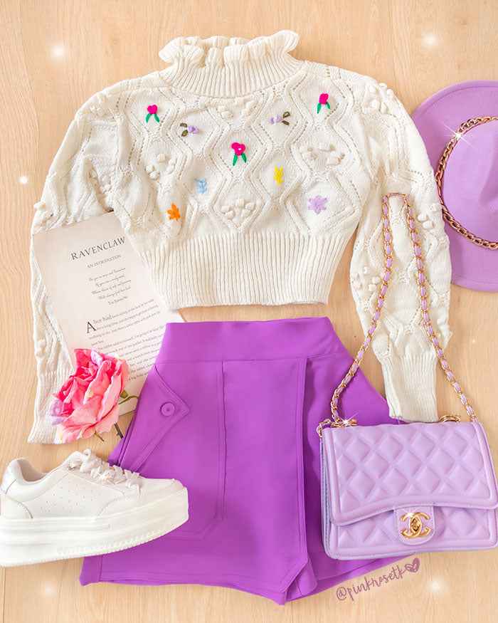 Buzo beige cuello alto bolero con flores bordadas