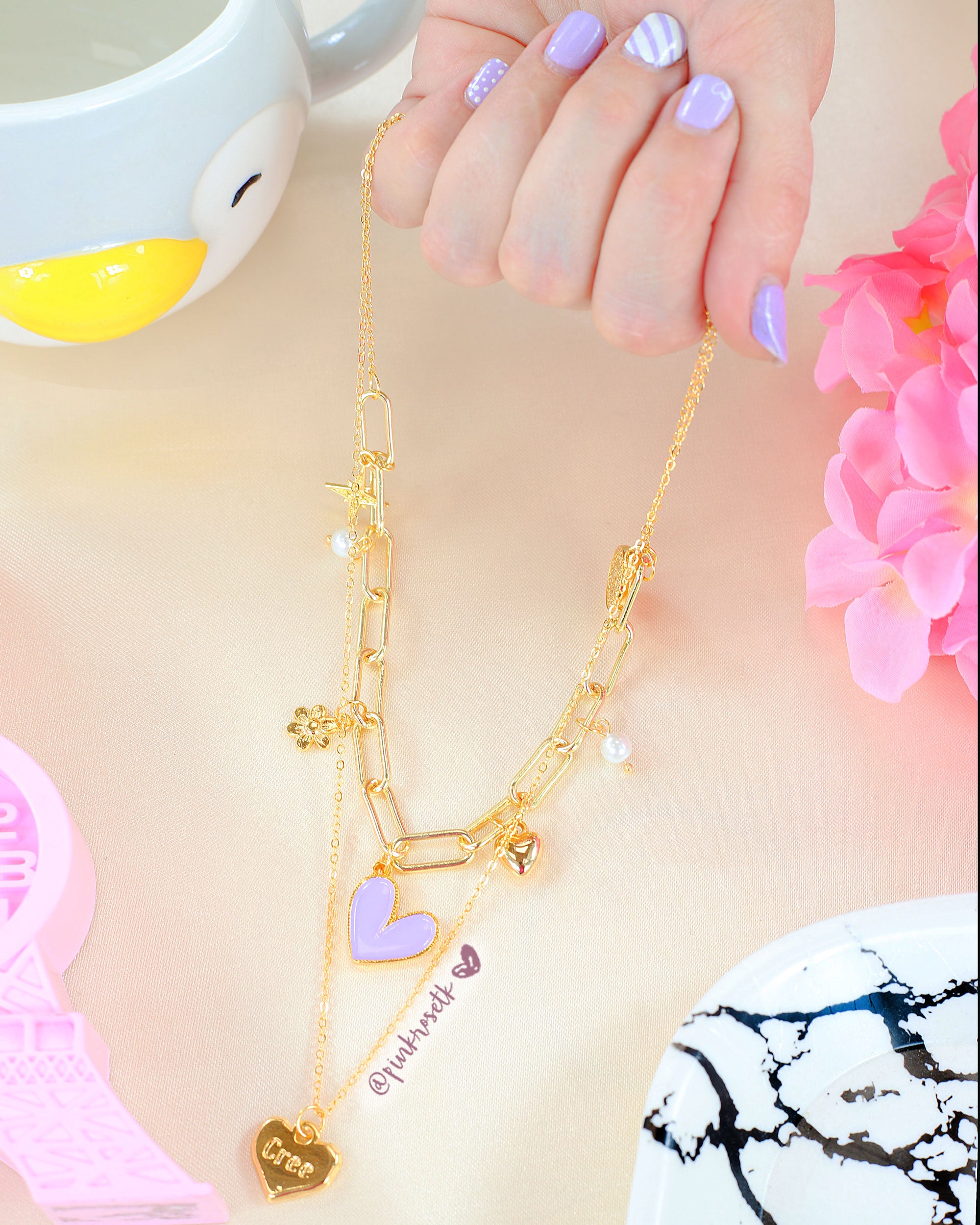 ¡Exprésate con estilo cada día con este collar doble único! Diseñado con eslabones doble corazón y dijes varios, ¡no habrá otro igual! Disfruta de un look personal y diferenciado sin sacrificar la calidad.
