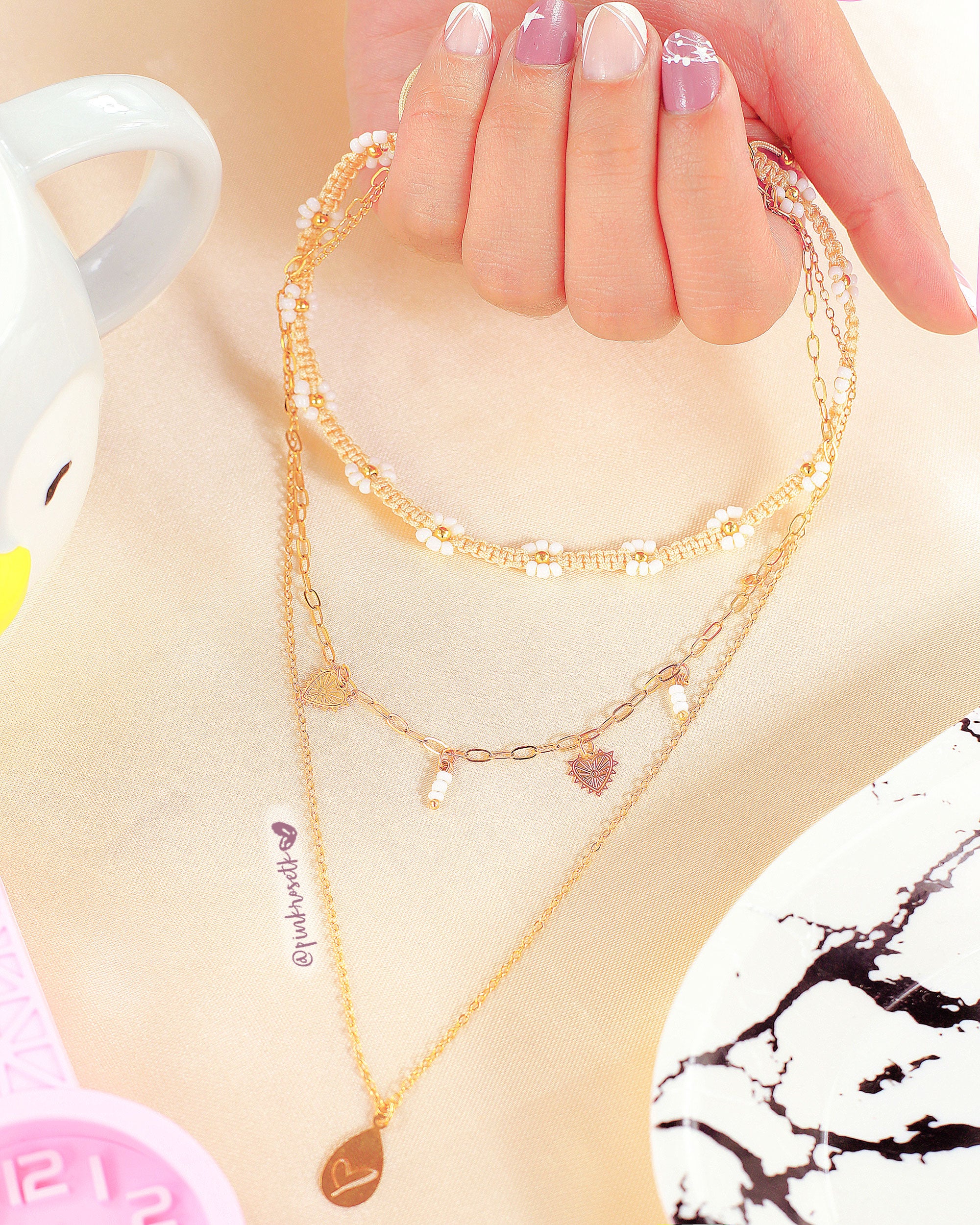 Una joya femenina y delicada que combina la frescura de las margaritas con la elegancia de los dijes en forma de corazón. El collar triple simboliza la conexión entre las personas, mientras que las margaritas evocan la pureza y la inocencia. Ideal para dar un toque de dulzura y romanticismo a cualquier atuendo.