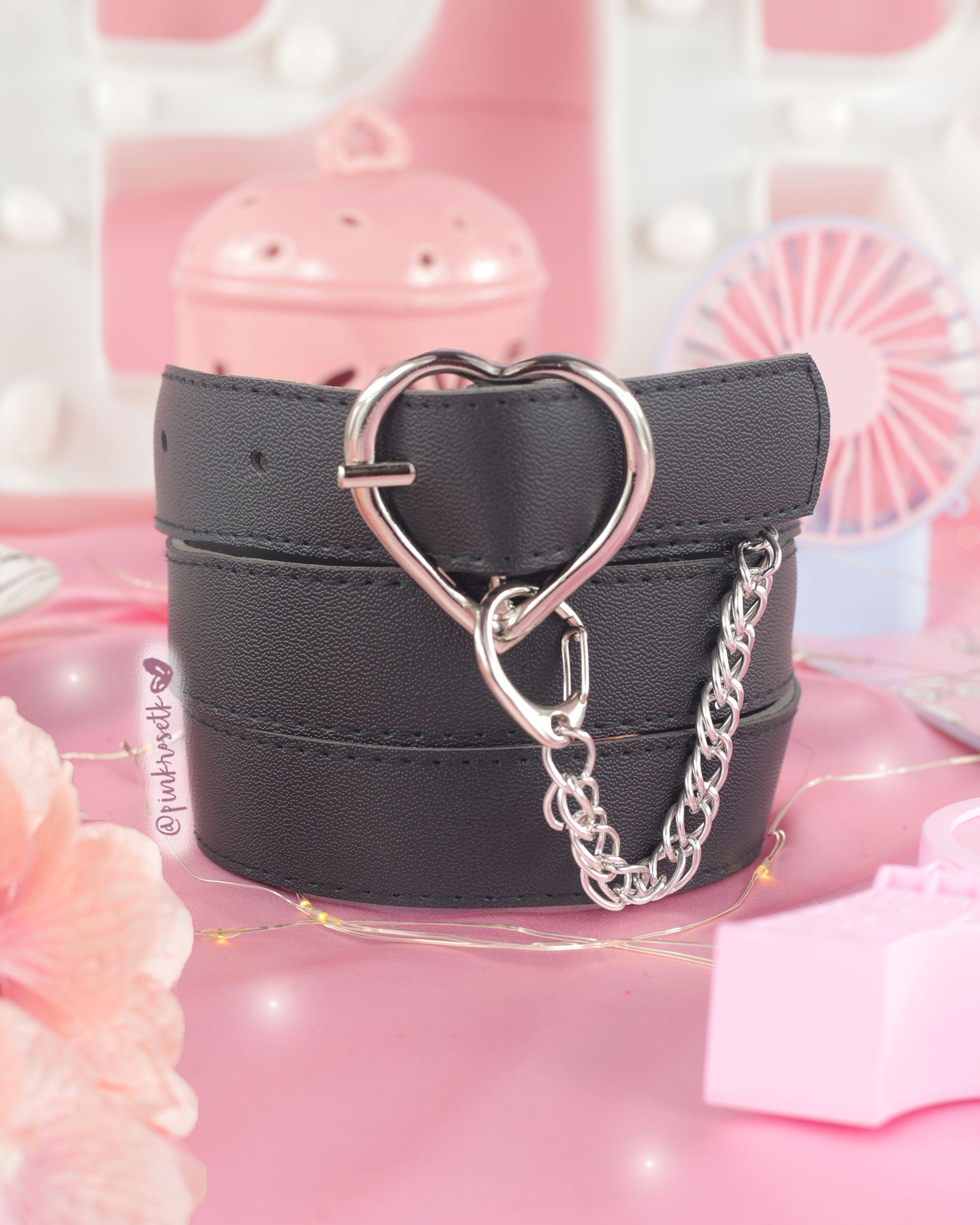 Correa negra de hebilla corazón con cadenita