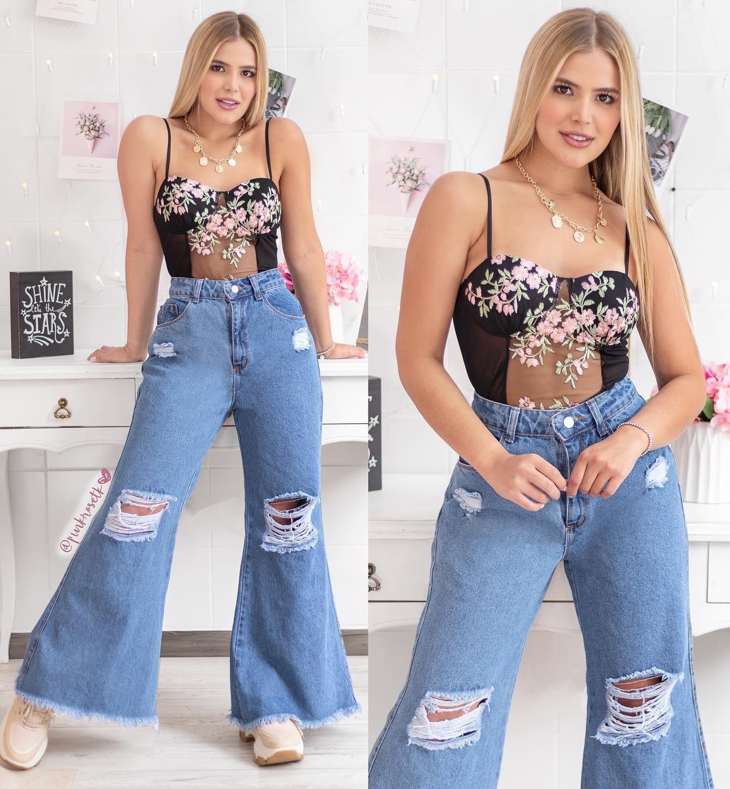 hoy te traemos un jean muy lindo, es bota campana lo que hace ver un poco mas alargada tus piernas y tiene unos rotos en las piernas que te haran lucir muy a la moda.