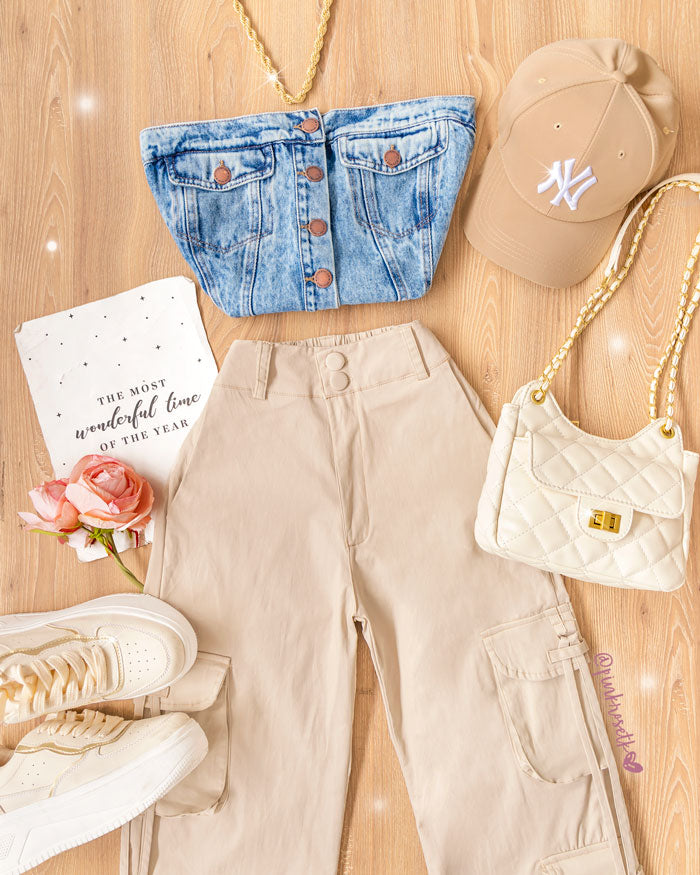 Disponible en una elegante tonalidad camel, nuestro Pantalón cargo doble bolsillo y tiras es la pieza de vestir perfecta para cualquier ocasión. Diseñado con dos grandes bolsillos para que guardes tus pertenencias, este pantalón se convertirá en tu prenda favorita para todos tus looks.