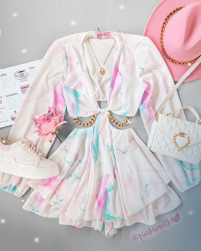 Este romper, con su efecto mármol pastel, es una prenda moderna y única. Está confeccionado con un tejido de calidad superior que ofrece comodidad y resistencia. El diseño con manga larga y detalle de cadena realza la delicadeza del romper. Una prenda versátil perfecta para la temporada.