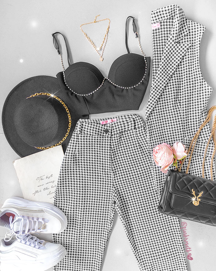 Disfruta este clásico set de pantalón y chaleco largo de cuadros blancos y negros. El diseño moderno y liviano se adapta a la perfección para un look casual y sofisticado. Elije una prenda para conseguir un estilo moderno con uno clásicos.