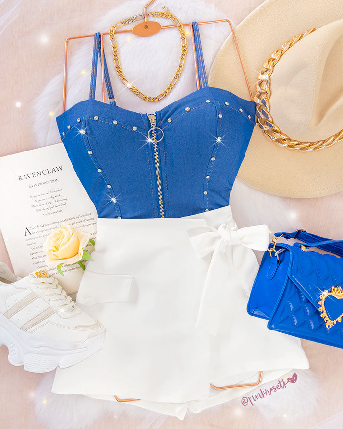 Blusa corta azul de tiras apliques de brillantes y cremallera