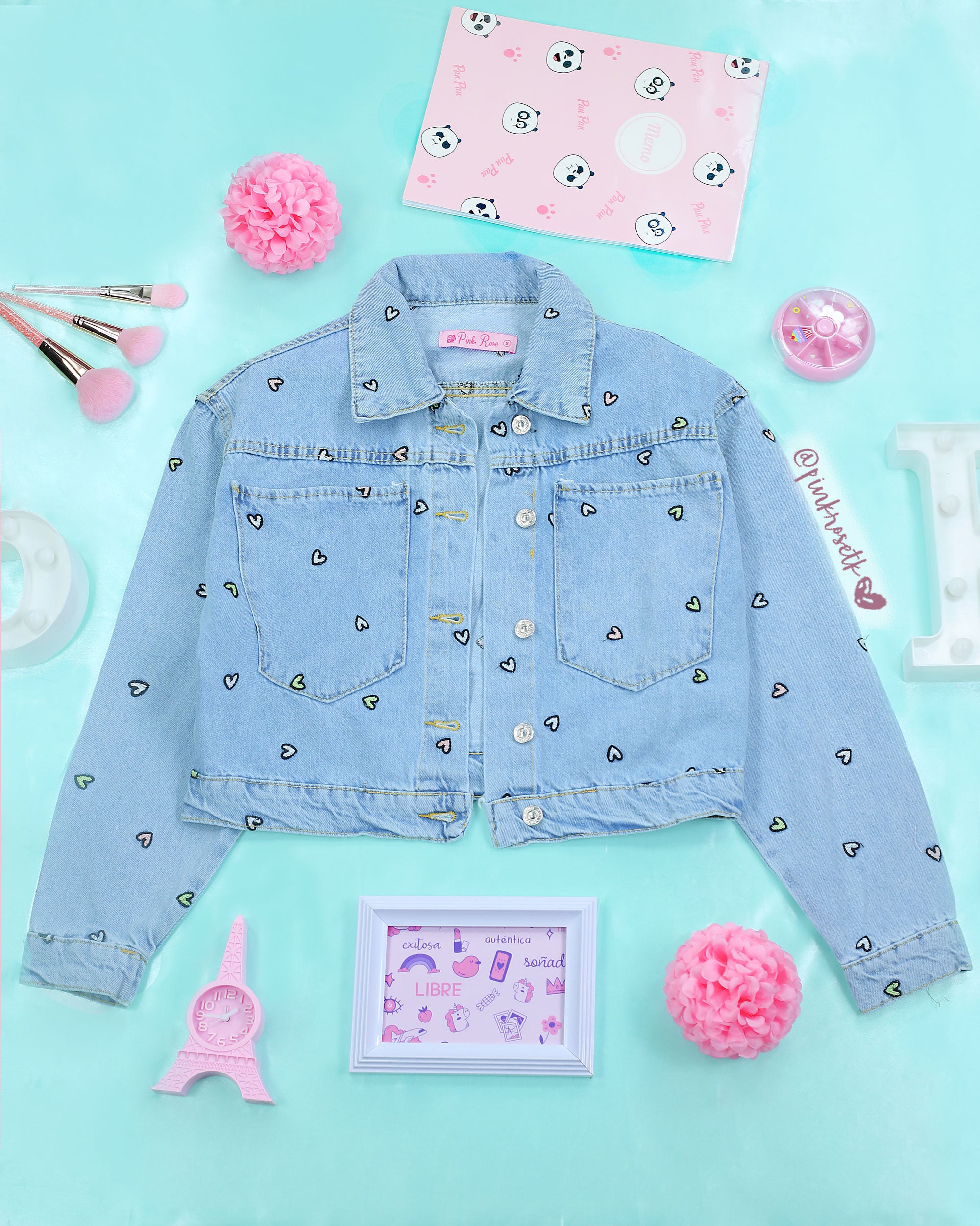 Este divertido diseño de chaqueta de blue jean es una combinación perfecta de modernidad y romanticismo. Los corazones bordados añaden un toque romántico a los clásicos jeans, creando un estilo único. Apuesta por una tendencia moderna y cool con esta chaqueta blue jean de corazones bordados.
