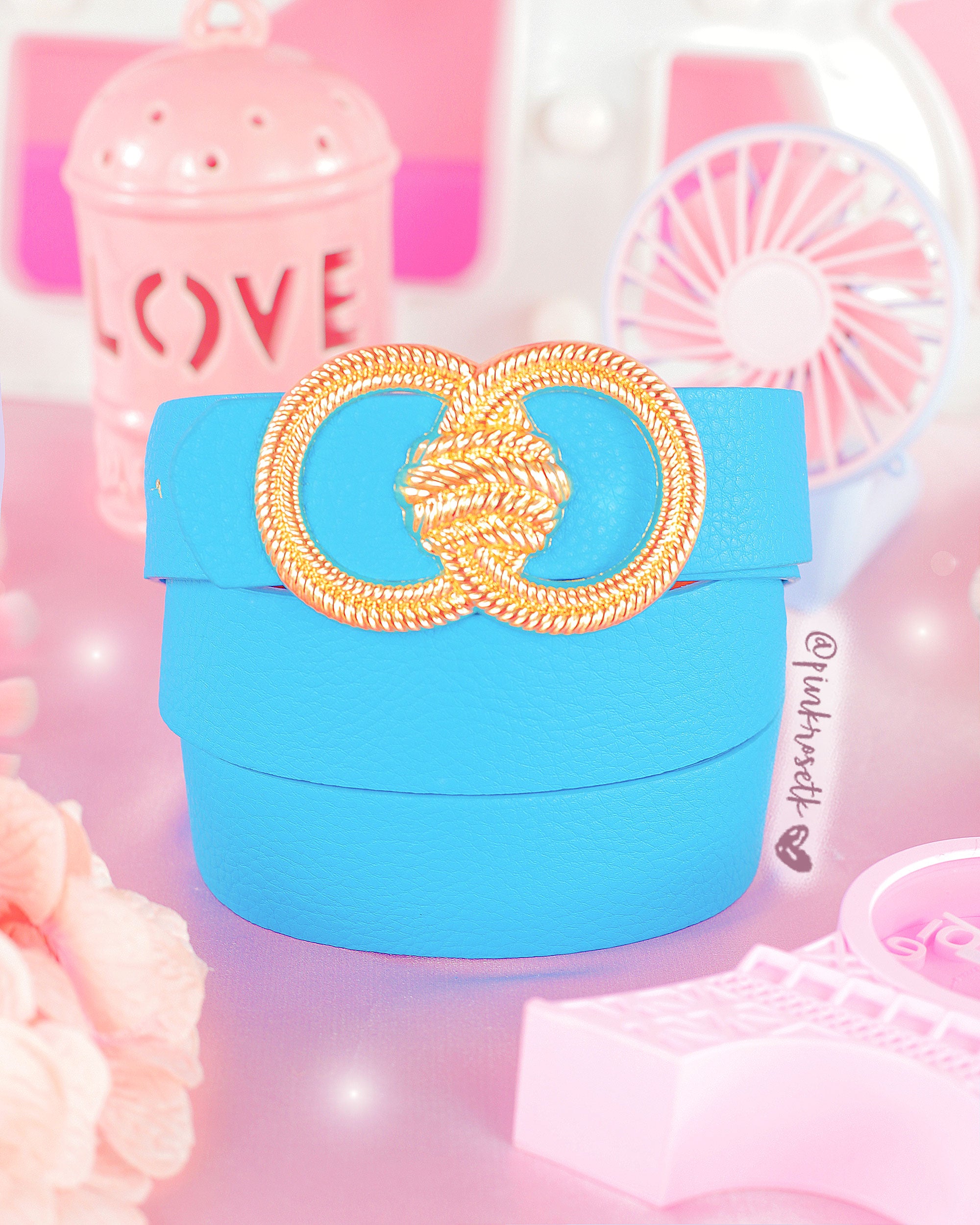 Este cinturón de herraje de aros dorados en color azul es la opción perfecta para agregar un toque de elegancia y frescura a cualquier outfit. Define tu cintura y luce a la moda con este accesorio versátil y moderno.