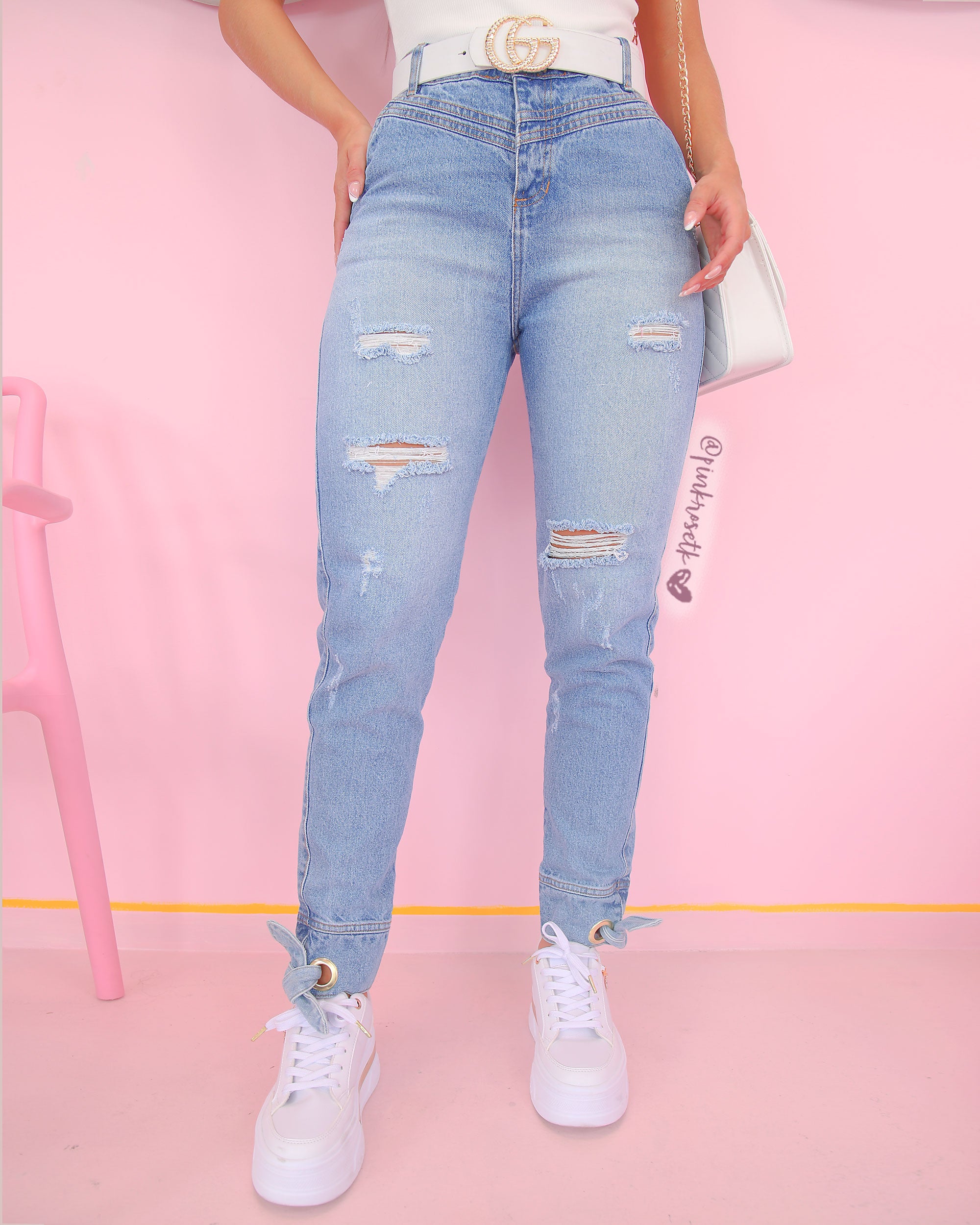 Este pantalón jeans de alto estilo combina desgastes modernos con detalles de clásica elegancia. El lazo en ruedo agrega la última tendencia en moda a esta pieza fundamental.