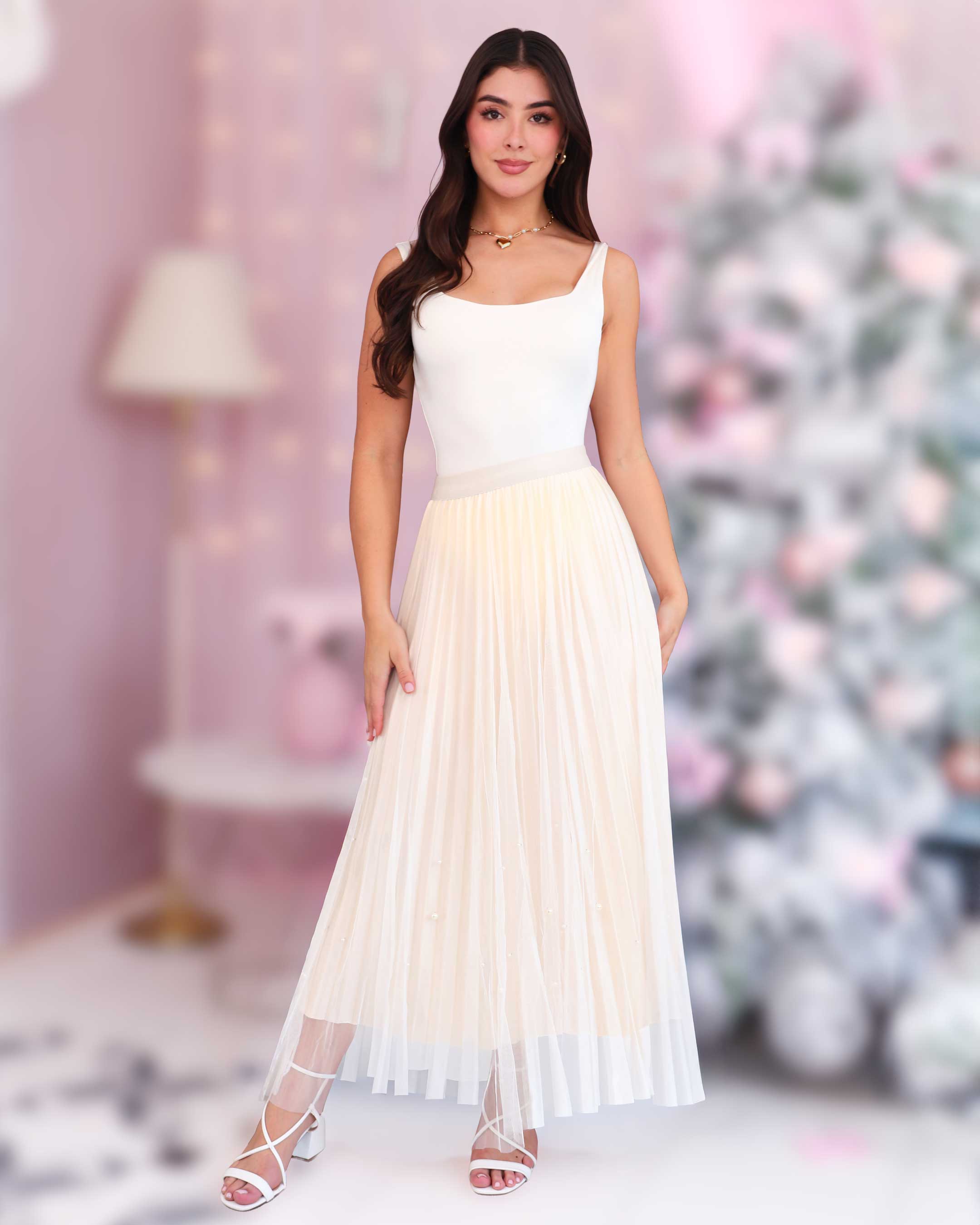 Su principal detalle distintivo es la aplicación de perlas decorativas, distribuidas cuidadosamente sobre el tul para añadir brillo, textura y un acabado delicado. Estas perlas transforman la falda en una pieza especial, ideal para ocasiones formales, sesiones fotográficas, eventos nocturnos o celebraciones donde se desea un look memorable.