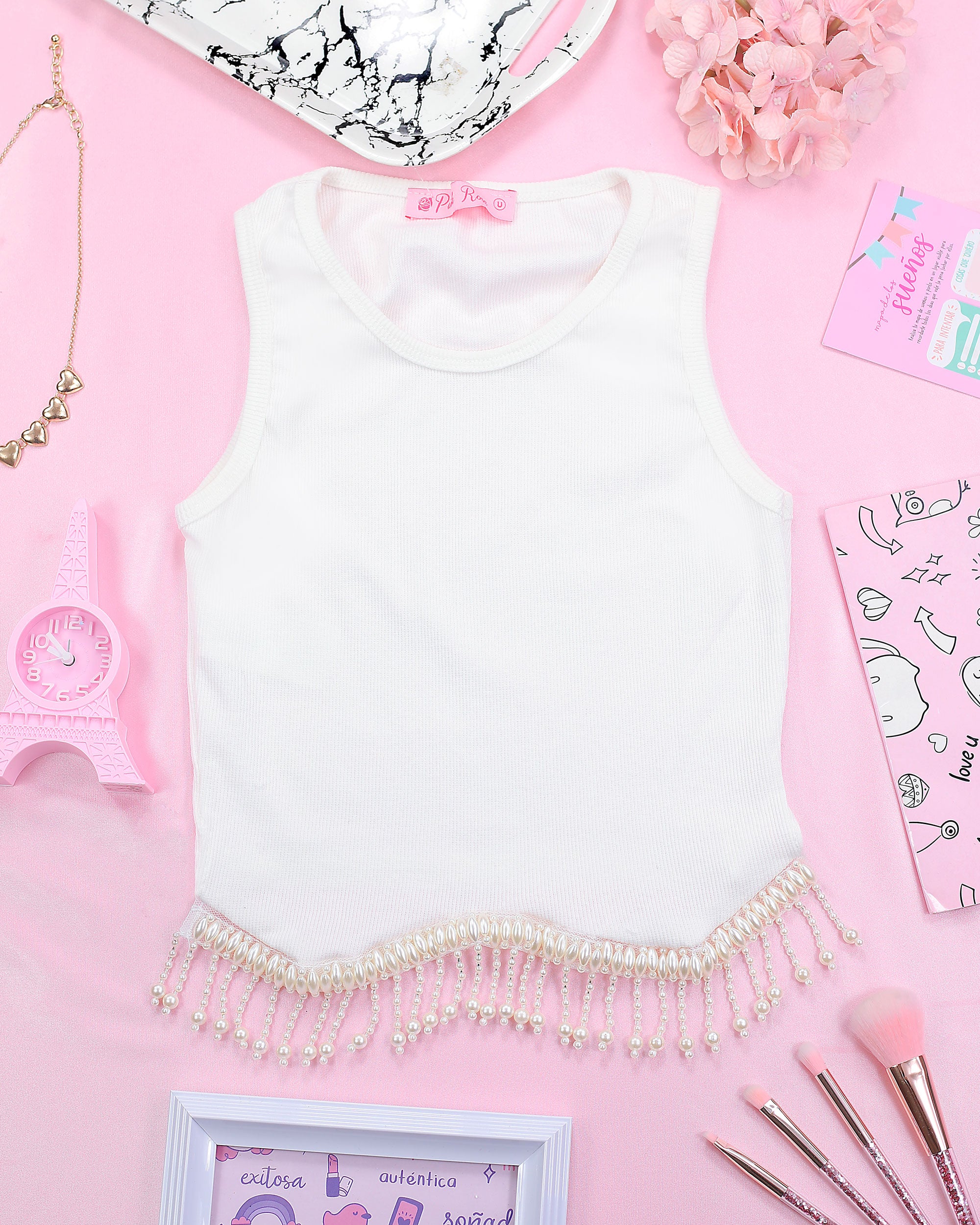 Nuestra Blusa corta básica blanco en rib con aplique de perlas es un must-have para crear un look único. Esta blusa se caracteriza por un rib suave y dulce combinado con un aplique de perlas para conseguir un acabado glamouroso. Perfecto para combinar con tus jeans favoritos para crear un look desenfadado chic.