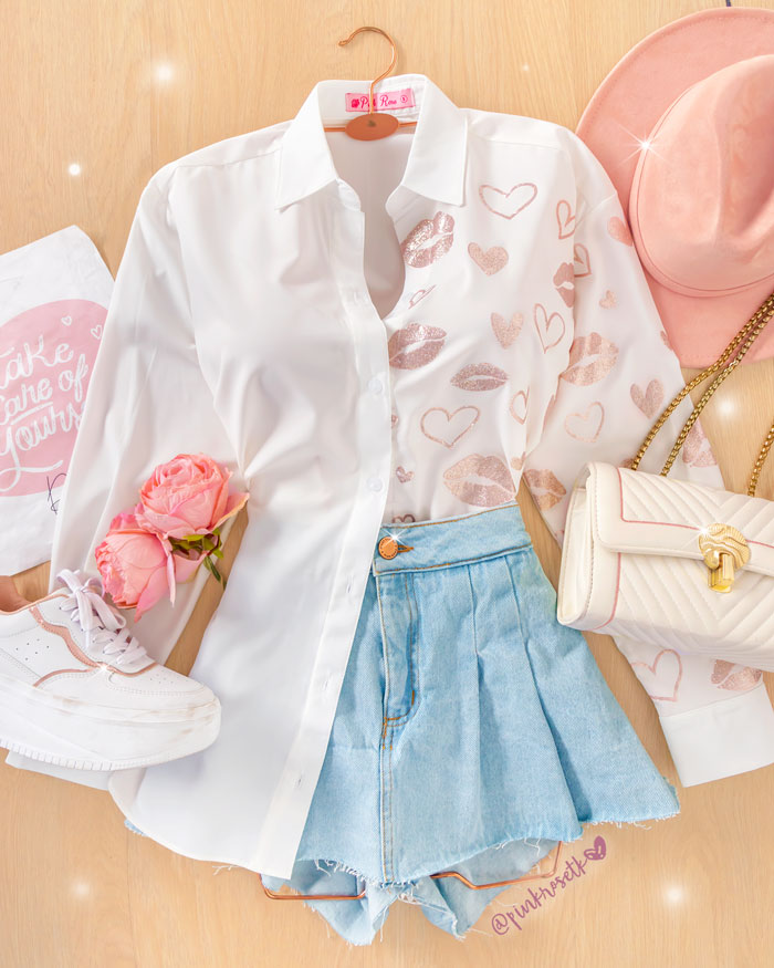 Camisa blanca manga larga estampado bocas corazones