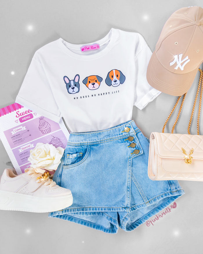 ¡Expresa tu actitud con esta divertida camiseta blanca! Esta prenda única tiene un color liso y los gráficos de tres perritos que proclaman "No Dogs No Happy Life". ¡Agrega un toque divertido a tu armario!
