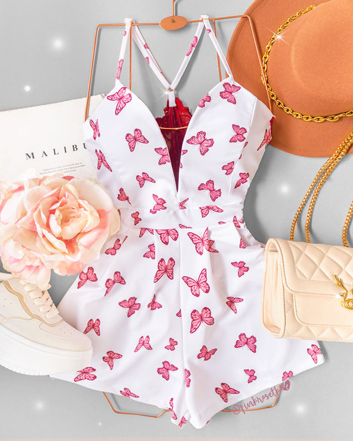 Romper blanco estampado de mariposas con varilla y encaje en la parte trasera