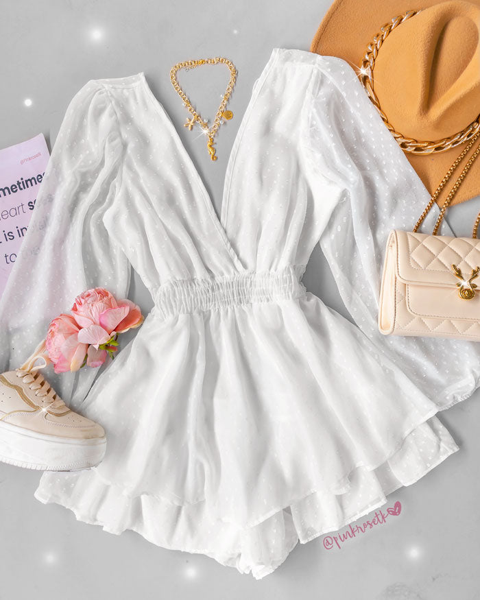 ¡Luce fresca y elegante con nuestro Romper blanco manga larga! Con su resorte en la cintura y escote en v, resaltará tu figura y te dará una apariencia moderna. Perfecto para un día en la playa o una noche en la ciudad. ¡Haz una declaración de moda con nuestro romper!