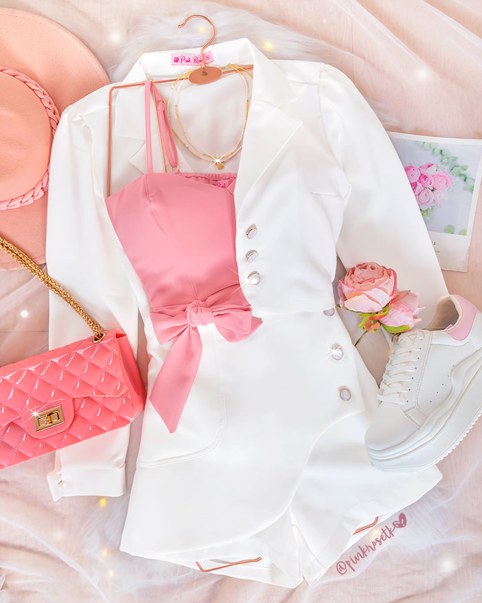 Este set blanco de falda-short y blazer con botones de perlas es una muestra de elegancia y estilo. Perfecto para cualquier ocasión formal o para darle un toque refinado a un conjunto casual. El color blanco puro y los botones de perlas añaden un toque de feminidad y sofisticación a este conjunto imprescindible.
