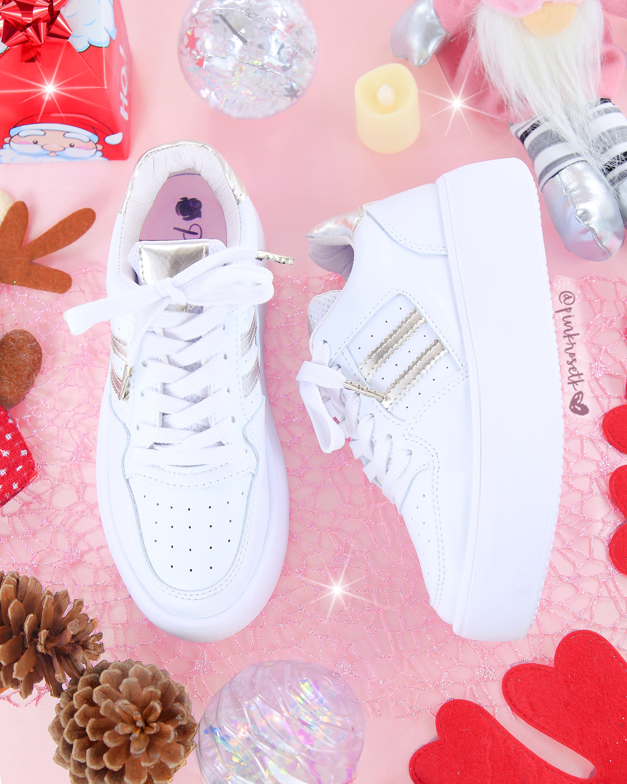 ¡Luce increíble con estos tenis blancos clásicos! Te encantará el estilo sofisticado de los detalles plateados que los adornan, ¡para que tu atuendo destaque! Estos tenis son el complemento perfecto para estar siempre a la moda.