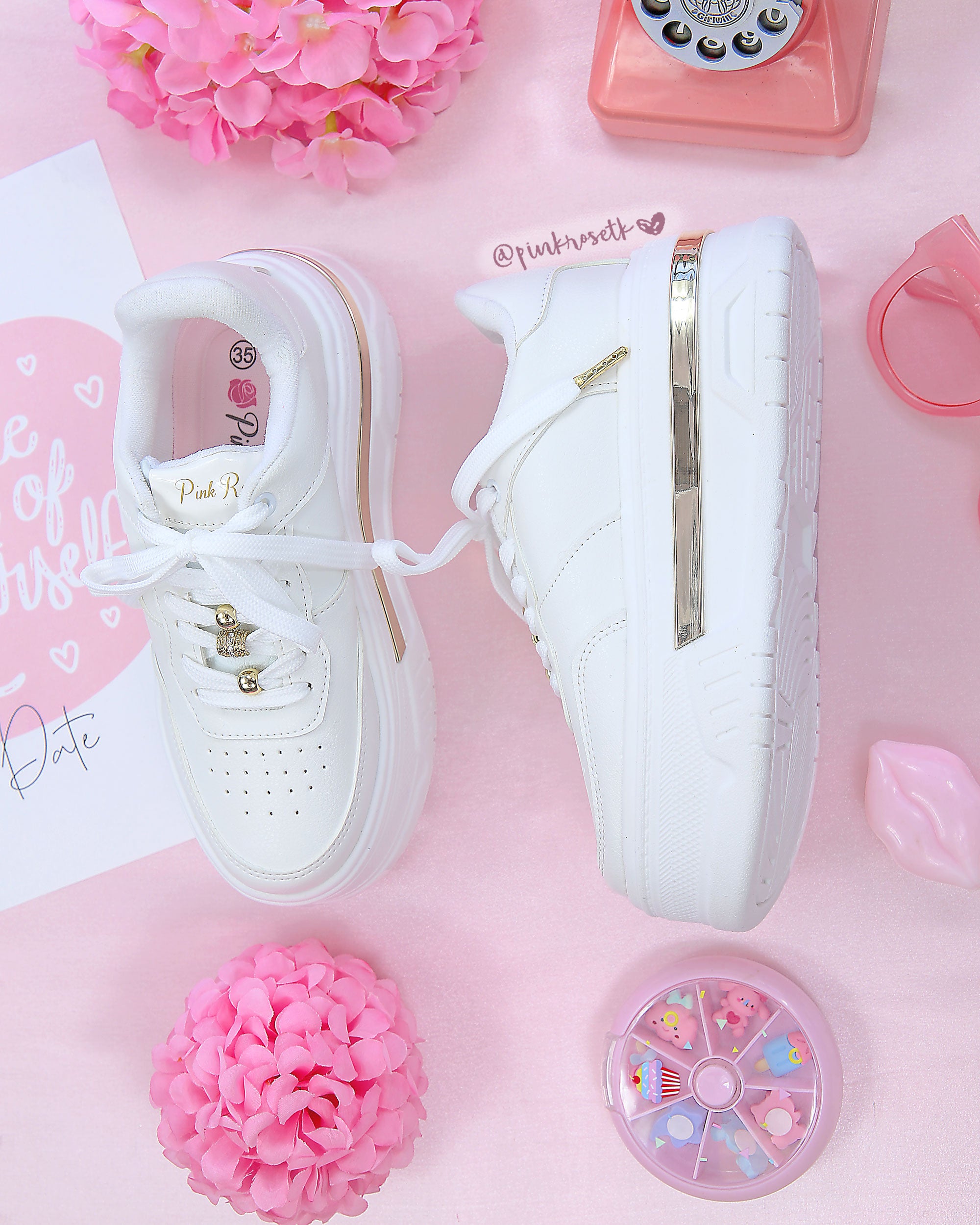 ¡Eleva tu estilo con estos tenis blancos con plataforma y adornos dorados! Añade un toque de glamour a tus pies mientras caminas cómodamente en una base elevada. Perfectos para cualquier ocasión, estos tenis te harán sentir segura y lista para conquistar el mundo. ¡Consigue los tuyos ahora!