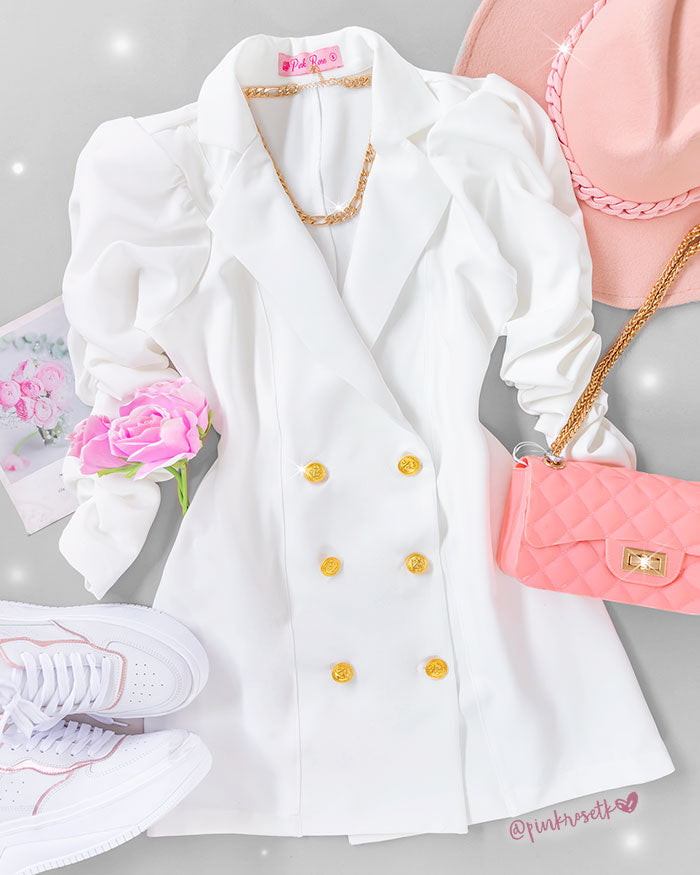 Este vestido blanco con manga larga presenta un diseño refinado con una recogida al frente. Adornado con botones dorados, combina a la perfección con complementos para crear un look sofisticado. Ideal para todas las ocasiones, puede llevarse con estilo para resaltar la belleza femenina.