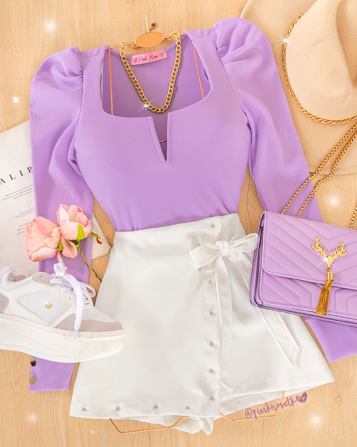 Blusa lila en rib, manga puff, cuello v con varilla