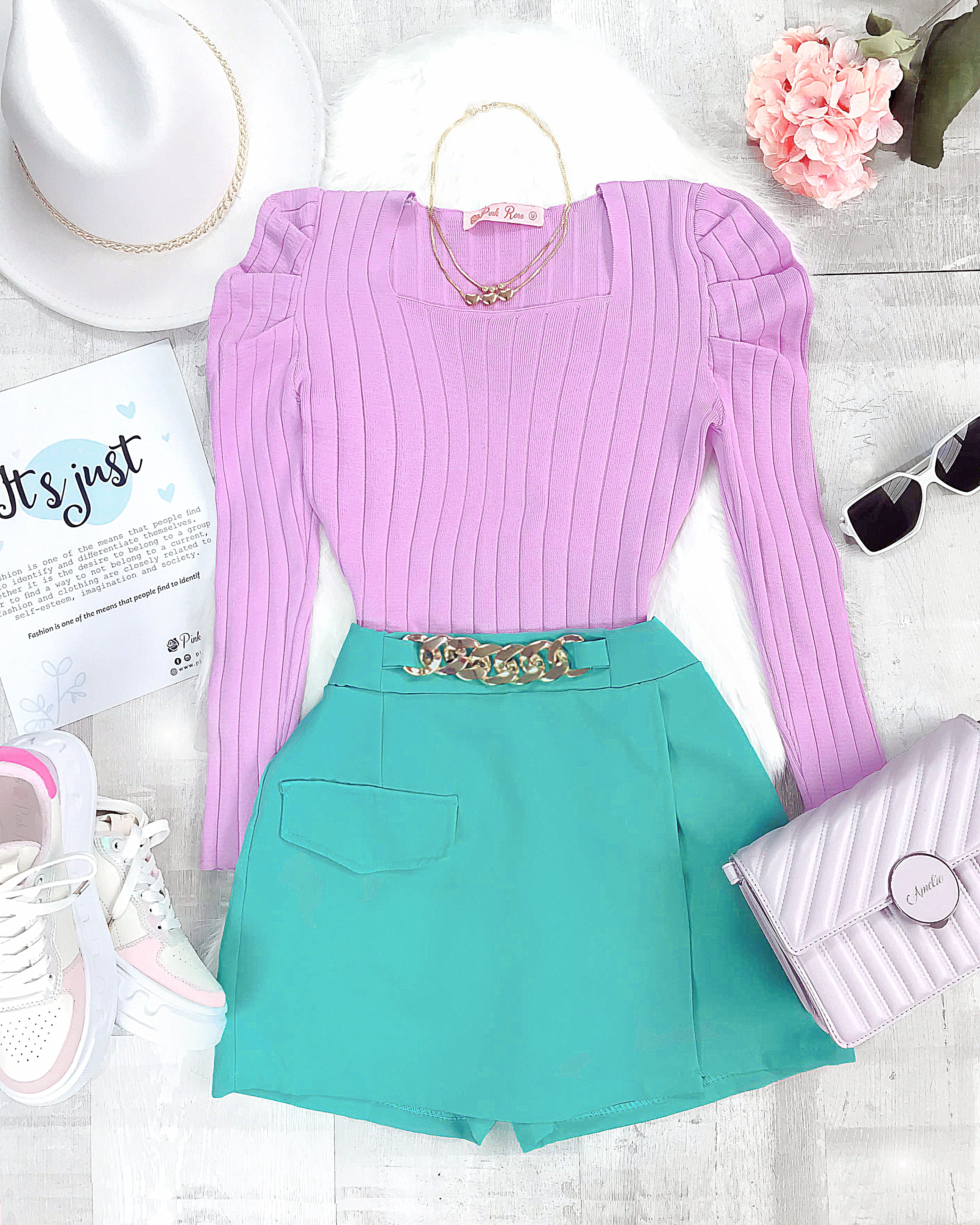 Blusa lila tejida líneas vertical manga puff