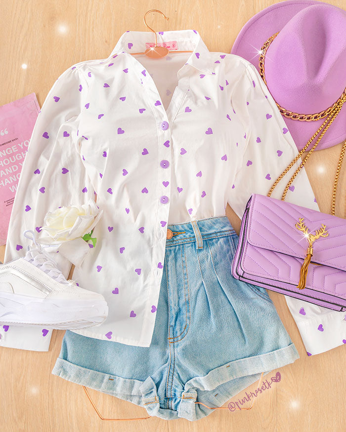 Camisa blanca larga de corazones lila