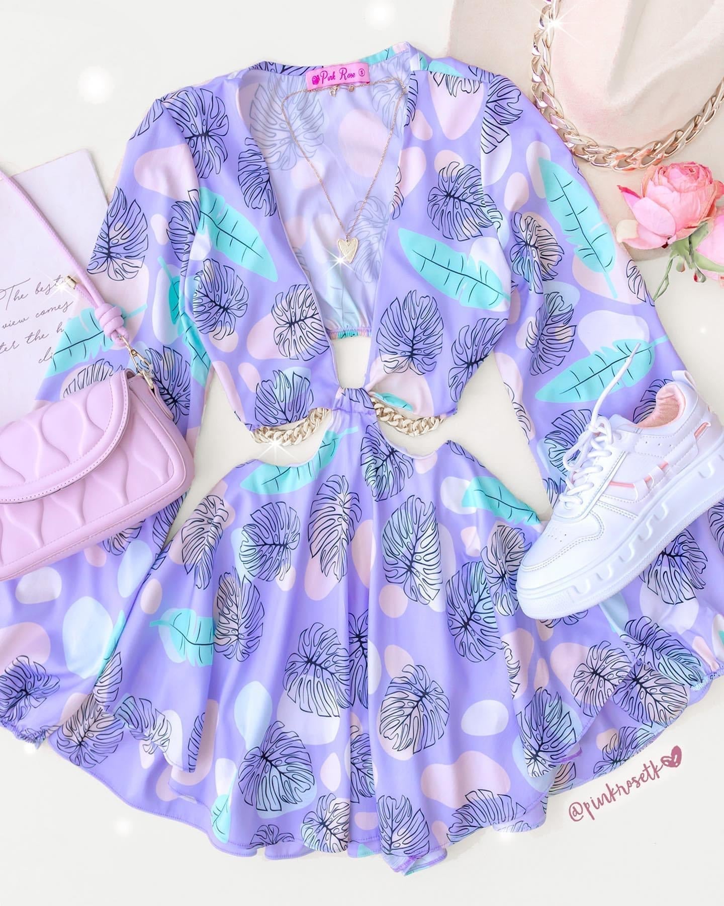 Romper de hojas en trazos en falso chalis con cadenita en la cintura.