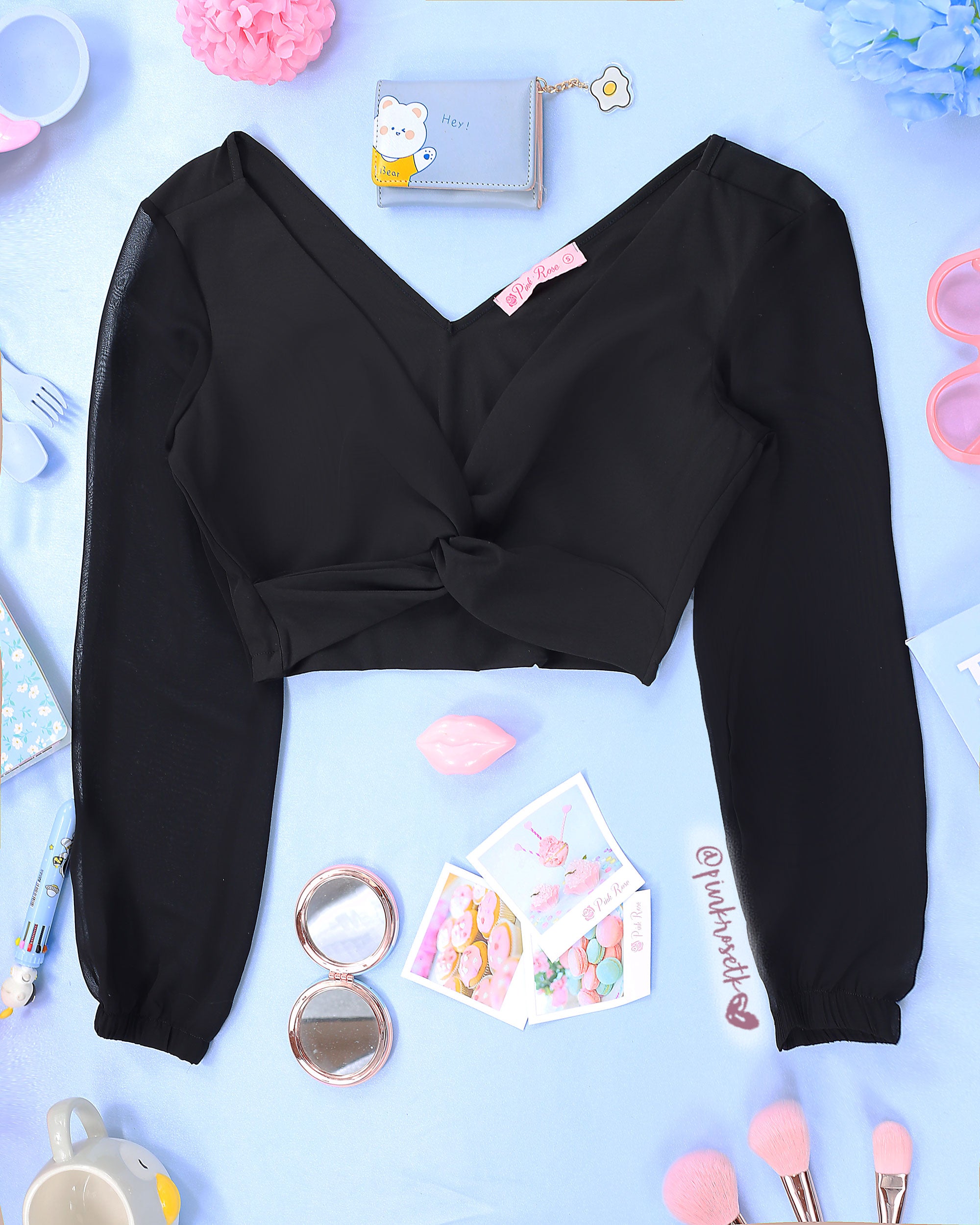Blusa corta negra con nudo en la cintura y manga larga de velo