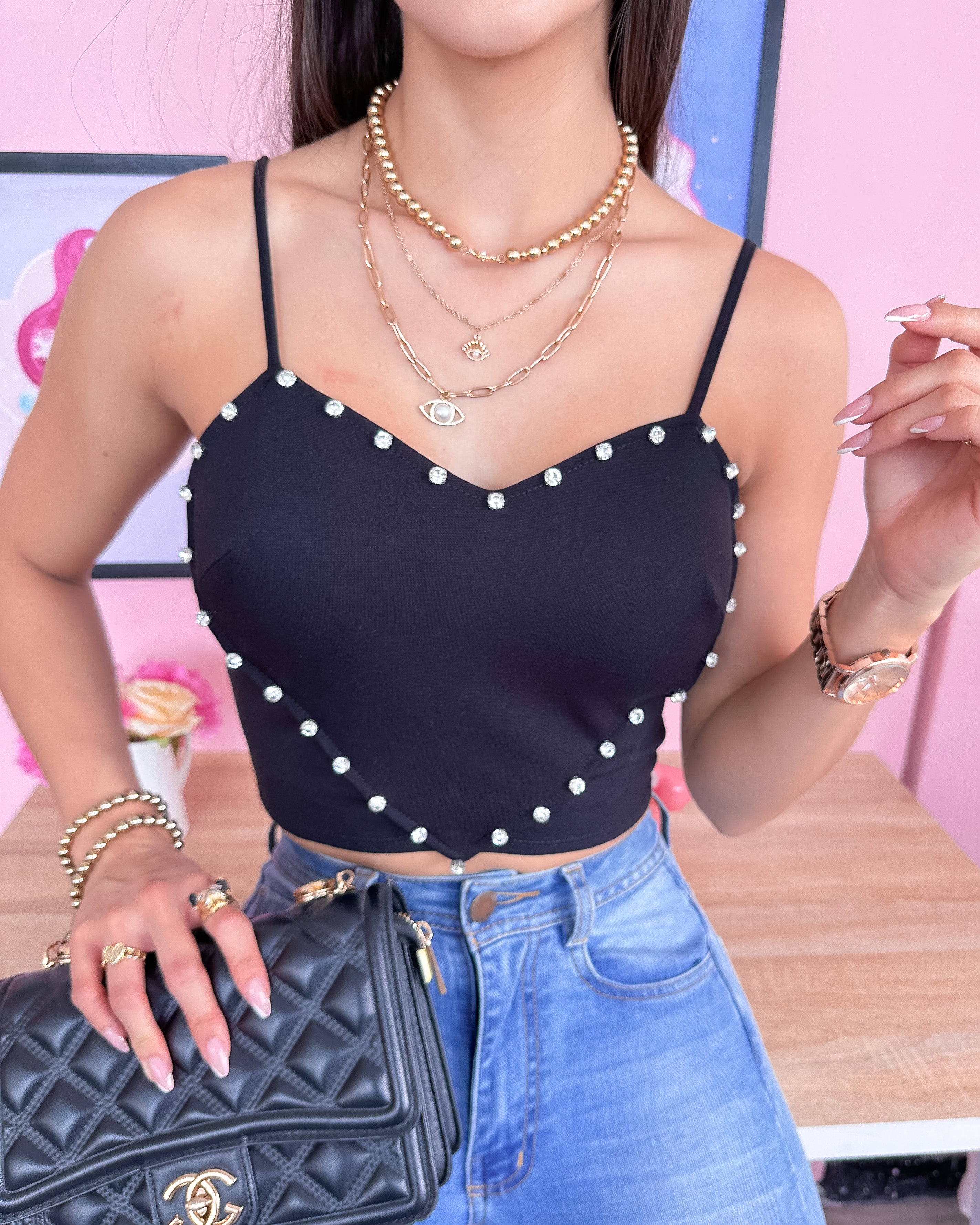Blusa corta negra de tiras con brillantes en forma de corazón