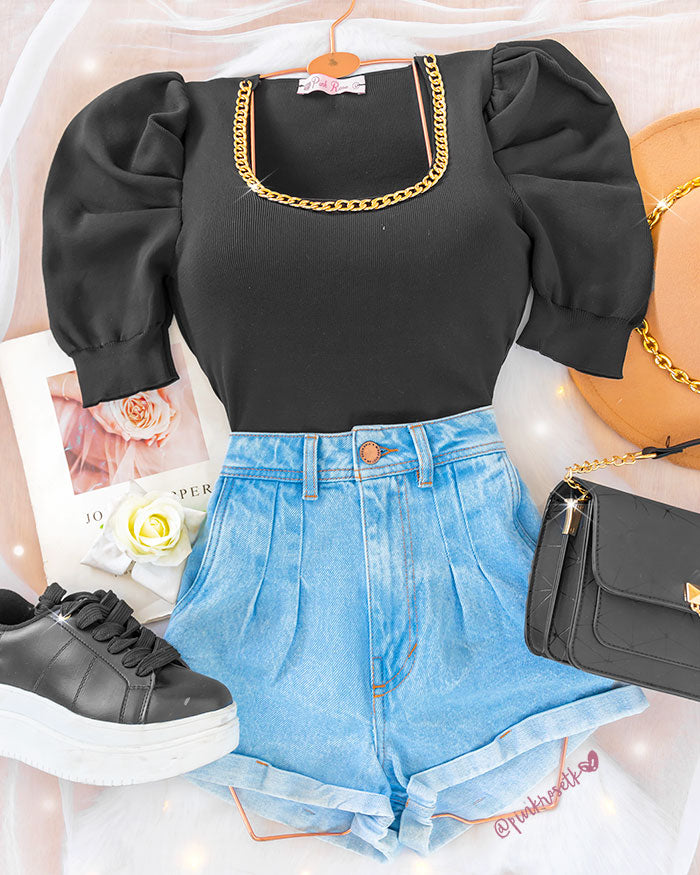 Esta blusa negra de punto con adorno de cadena es el complemento perfecto para tu outfit. El tejido de alta calidad es suave, ligeramente elástico y garantiza confort a largo plazo. El lujo del adorno de cadena le da un toque de distinción.