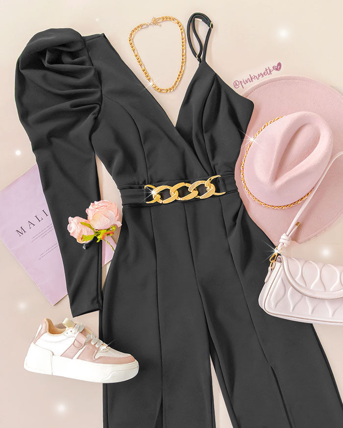 Enterizo negro de una manga puff cadena en cintura y abertura en la bota