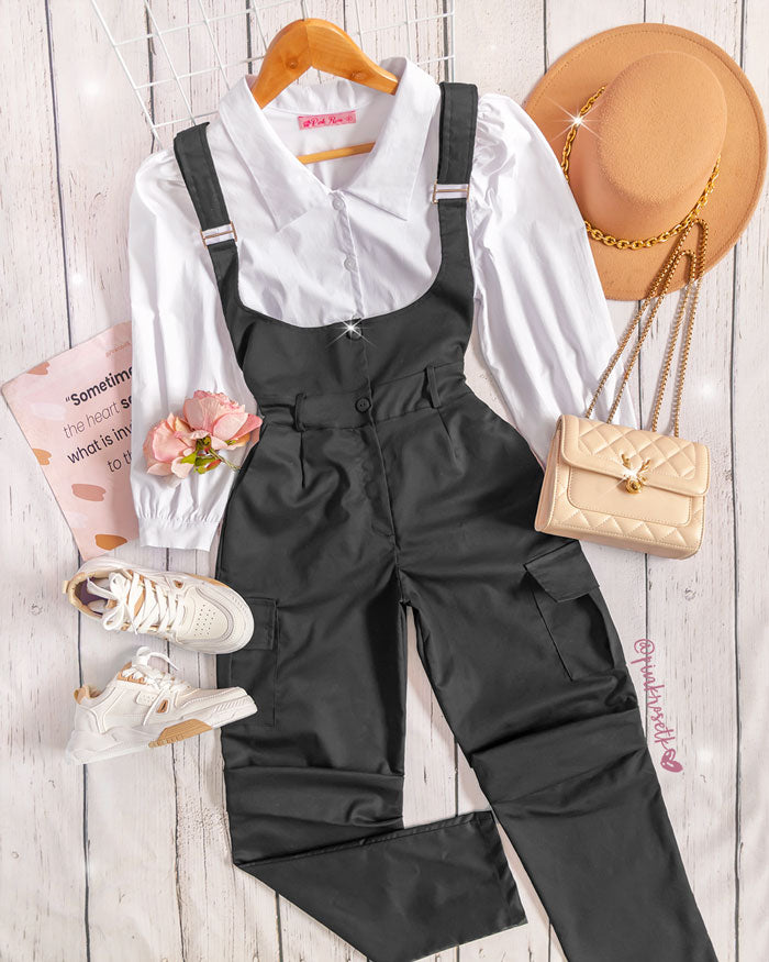 ¡Innovador y versátil! Nuestro enterizo negro cargo tipo overol es perfecto para un look casual pero moderno. Con su diseño de rodilla drapeada, le da un toque original y cómodo. Ideal para cualquier ocasión y fácil de combinar con tus prendas favoritas. ¡Haz una declaración de estilo con este enterizo!